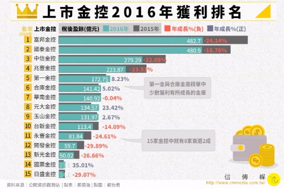 2016年上市金控獲利數字全面揭曉,蔡明忠的富邦金以482.7億元稅後淨利蟬聯8年金控獲利王寶座,堂哥蔡宏圖的國泰金控則以480.9億元緊追在後,辜家的中信金排第三,上市公股金控龍頭兆豐金雖遇到美國洗錢裁罰案,但仍以223.87億元成績單搶進前4,然而今年金控獲利普遍衰退,4家平均較去年衰退21%。