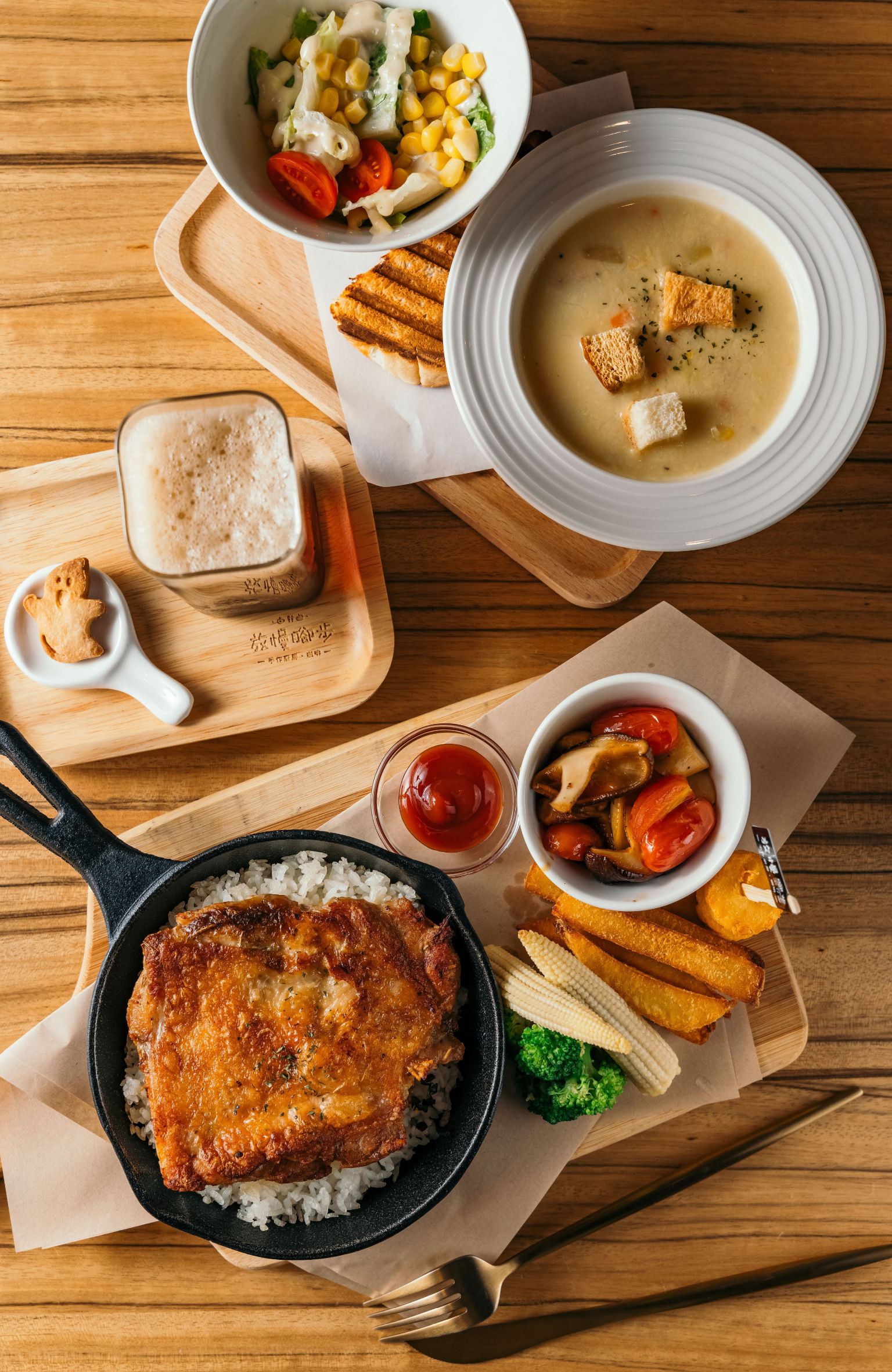 如果想在店內的室內野餐區用餐美拍,須事先預約才不會錯過。而店家的內用限定料理也很多元,舉凡義大利麵、貓耳麵、咖哩飯等,應有盡有,其中排餐類的爐烤迷迭香煎腿排,為了充分利用雞汁精華,店家將煎至金黃色的雞腿排,與米飯一同送入烤爐,因高溫而逼出的雞汁完全吸附在米飯上,舀起米飯,濃郁香氣撲鼻而來,只需一口便能感受雞汁鮮美與米粒的飽滿。