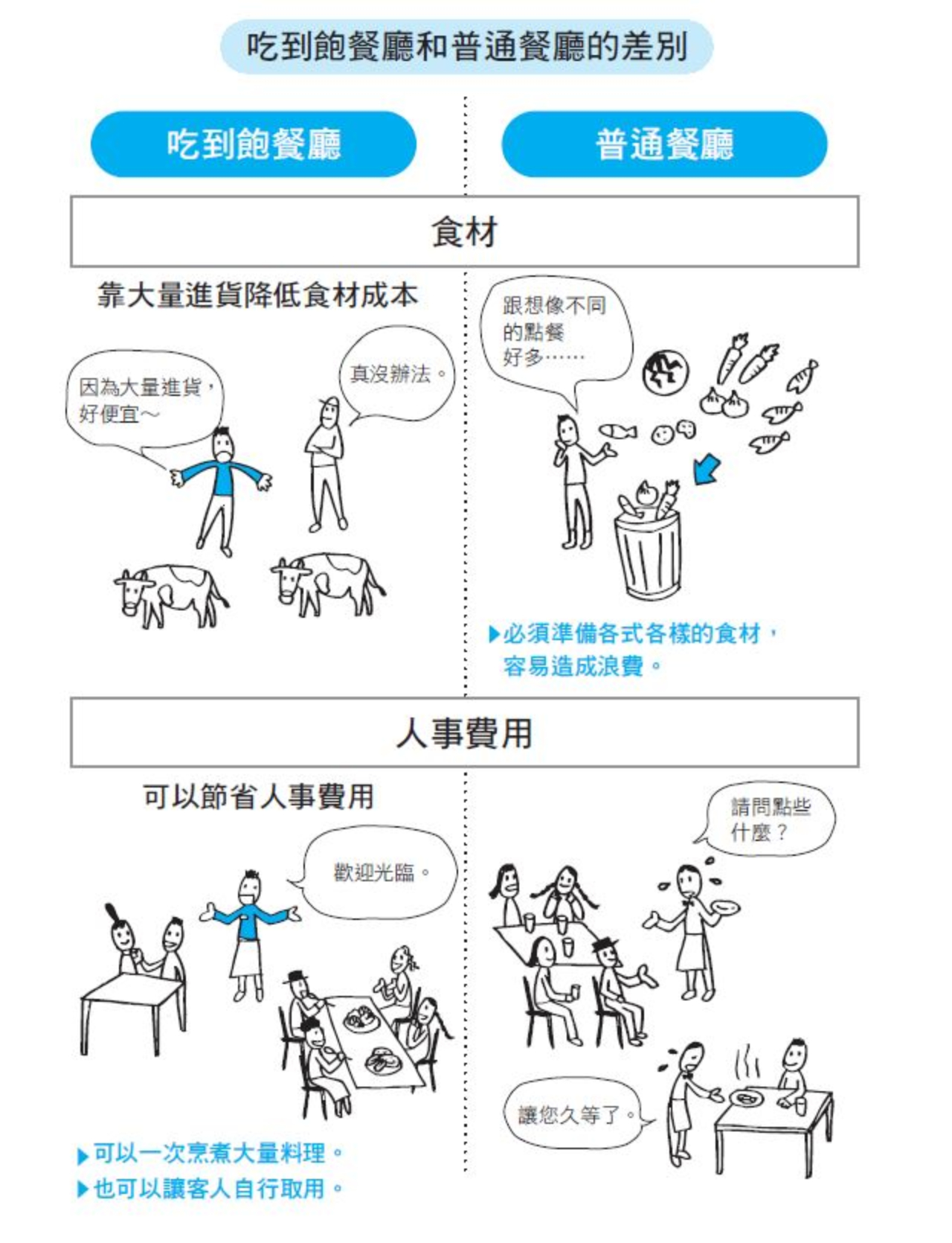 再來看廚房。客人點餐之後,一般餐廳的廚師必須一邊推算出菜時機、一邊逐份烹煮客人的餐點,但自助式餐廳卻可以一次料理幾十人份的餐點,兩者之間的效率是天壤之別。如果是壽喜燒、涮涮鍋或燒肉吃到飽餐廳,客人還會開心地自己動手料理,因此甚至不需要雇用廚師。只是切肉跟蔬菜並分配食材的工作,機器或工讀生就能勝任了。