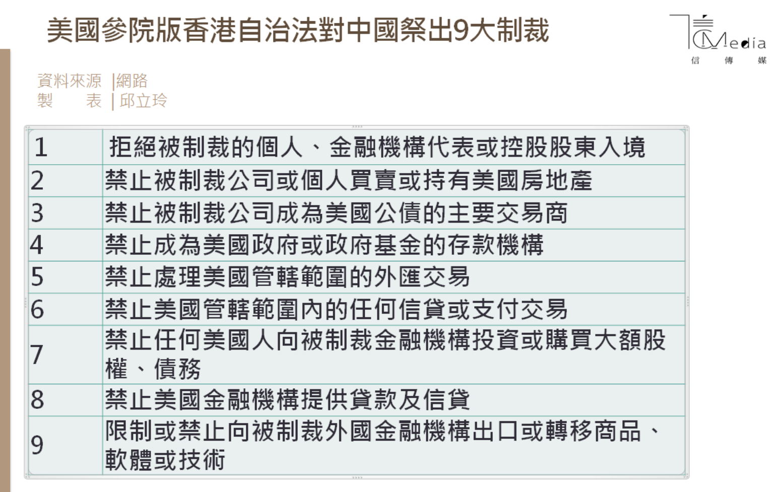 參院版提出9項制裁措施,包括拒絕被制裁的個人、金融機構公司代表或控股股東入境、禁止被制裁公司或個人買賣或持有美國物業等。