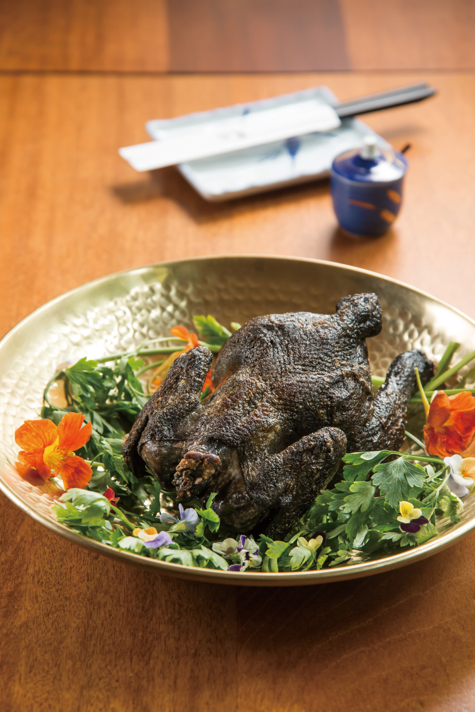 「燒鳥起源於江戶時代,是日本料理中很特別的支流,可以是路邊攤,也可以立吞的經營模式,也可以是餐廳料理。」Tommy致力提升燒鳥的精緻度,並思考如何變化、加入不同元素,烹調手法也涵蓋日式、法式、義式,像是特別推薦的「爐烤烏骨雞」,就融入法式春雞的概念。先將迷迭香、奧勒岡等香草塞進雞肚中,並以煎過的蒜頭加鹽搓揉醃製,將雞吊起來風乾1天入味後再燒烤上桌,品嘗起來鮮嫩可口且洋溢香草香氣。