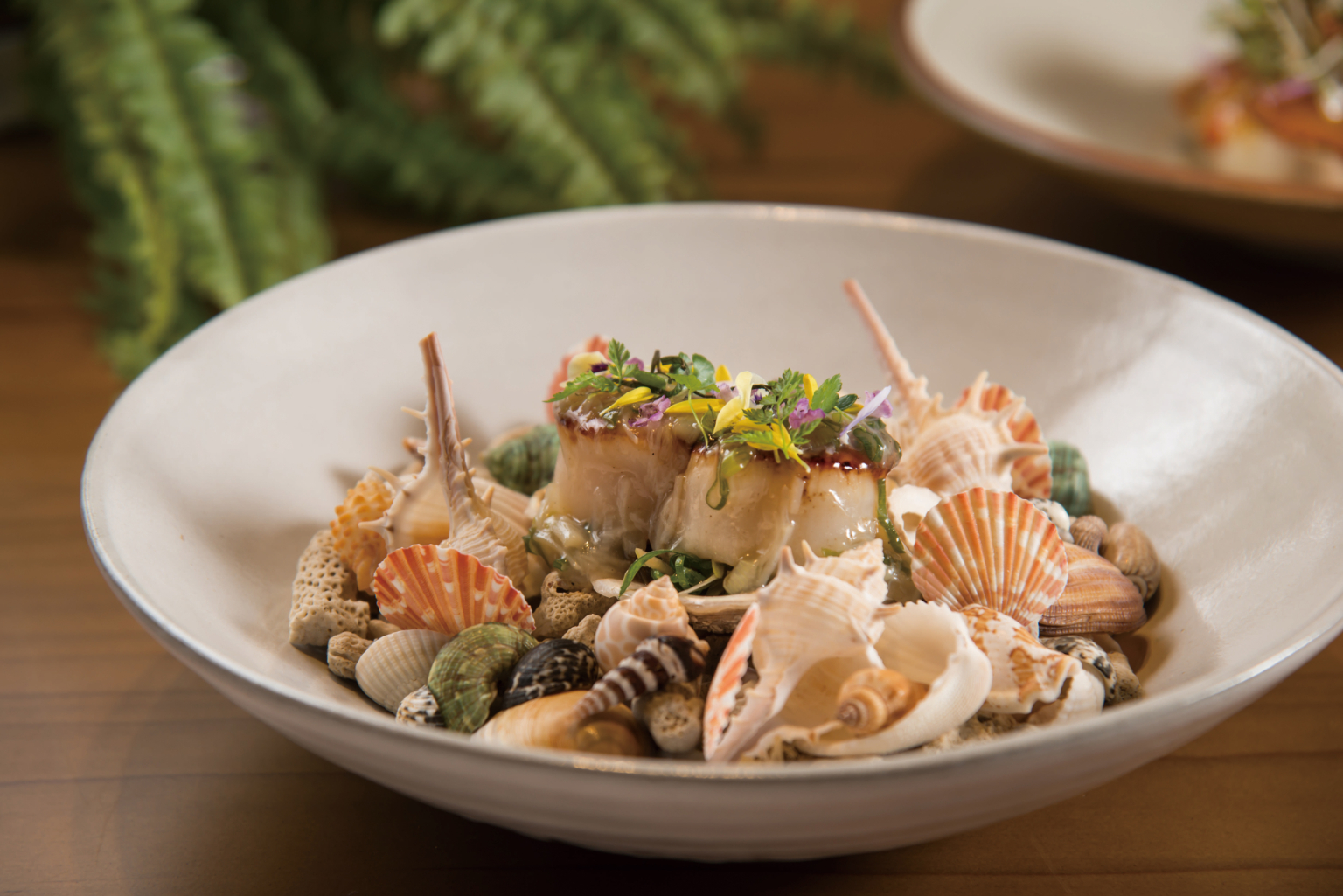 阿元每一季都會更換一次菜單,以精緻的手法呈現出中、西餐融合的料理。他對擺盤也相當講究,每一道上桌的佳餚都別有意境,例如海味及鮮味十足的「北海道干貝 宜蘭三星雨來菇」就運用許許多多貝殼為盤飾,讓人彷彿看見大海及沙灘!吃阿元的菜餚,不僅僅是味覺饗宴,也讓視覺驚艷!
