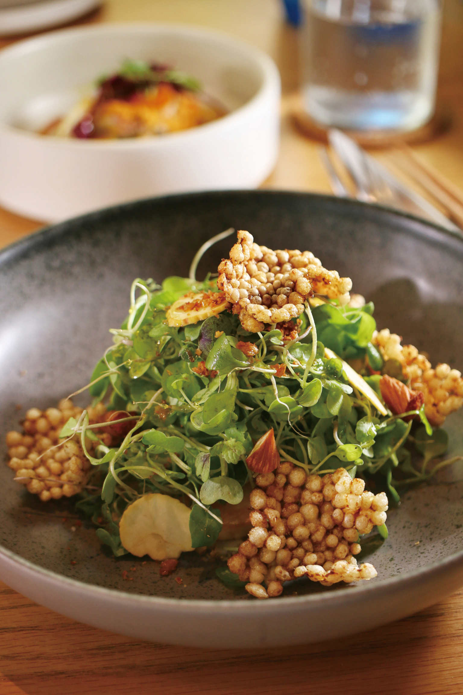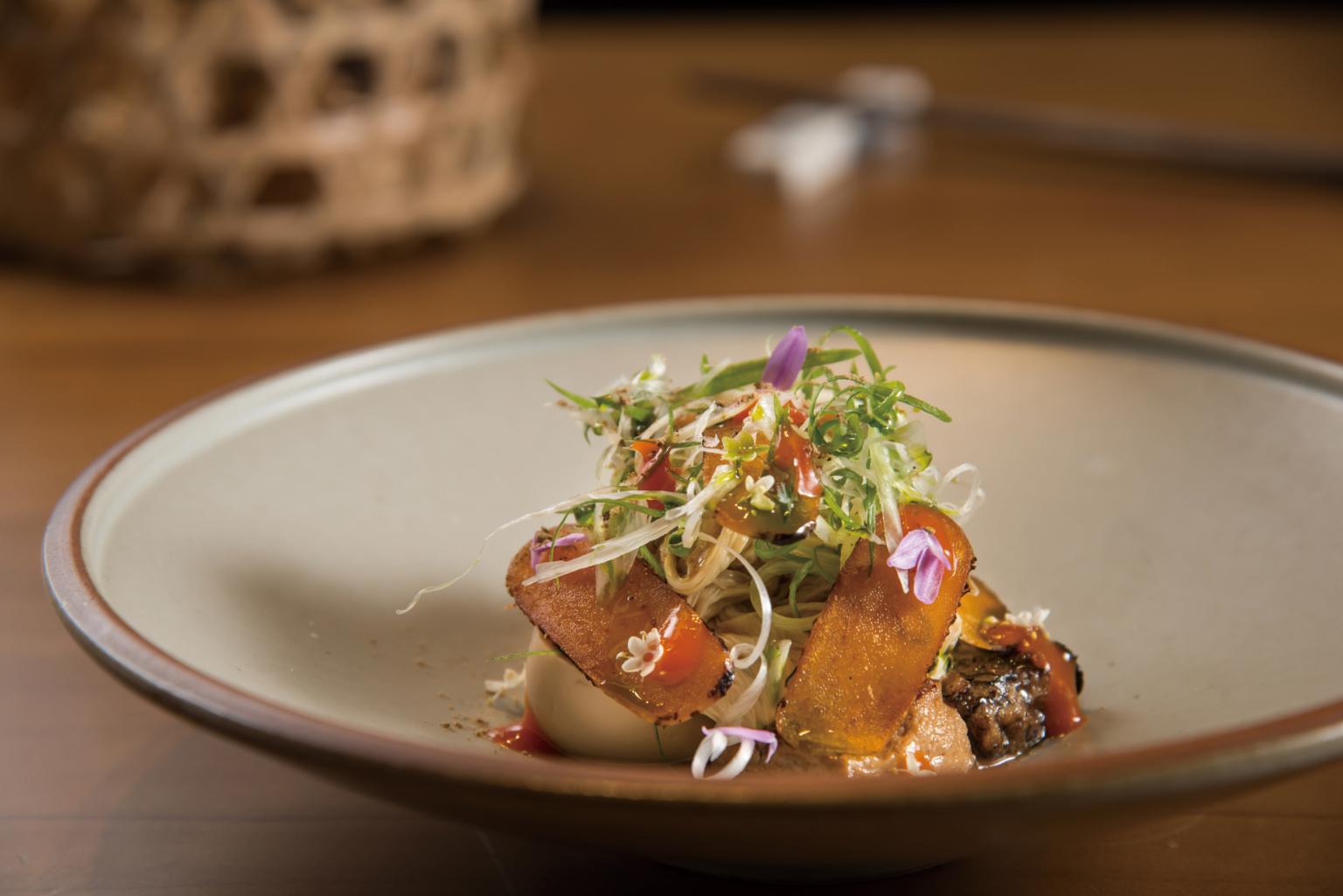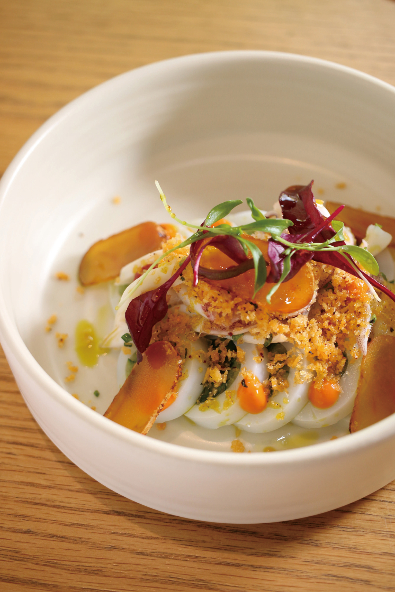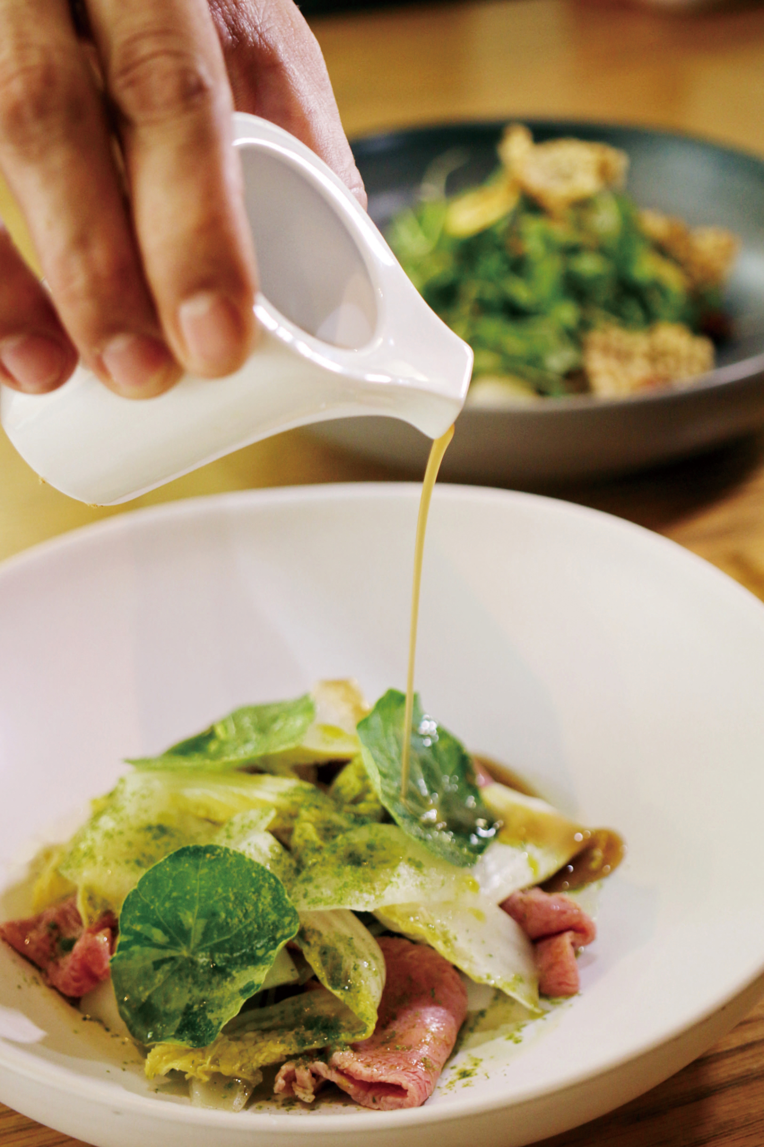 經營理念說來簡單,然而在林凱維手中變化出的料理卻不簡單!本科系出身的他,高雄餐旅大學畢業後,曾前往法國工作和習藝,擅長以中西融合的手法烹調。翻開菜單不難發現,這不一定是西餐或中餐,因此餐具也準備了刀叉及筷子。有供應「好吃的飯」,滷肉飯搭配了鹹蛋黃、鴨蛋酥及糖心蛋,噴香四溢;「鮑魚.栗子.鮑魚肝脆片」做工繁複,澳洲鮑魚低溫烹調後切片,搭配栗子泥、炒過的栗子碎,再擠上焦化奶油,鮑魚肝則與西谷米一起烹煮後,烘乾再炸成脆片,每個環節都誠意滿滿。「慢燉牛雜.台灣牛紐約客.菜脯牛肉湯」堪稱牛肉全餐!牛筋、牛頰、牛肚燉煮入味,還加入汆燙過的紐約客牛肉,並以菜脯熬煮牛肉高湯,帶來豐富食趣。