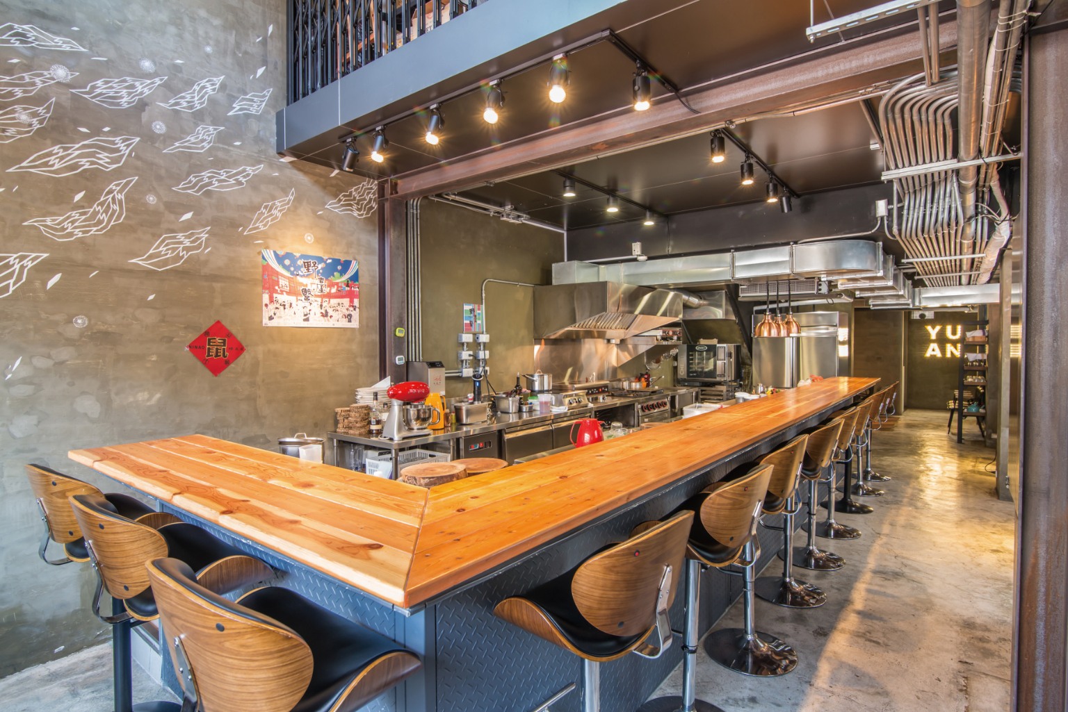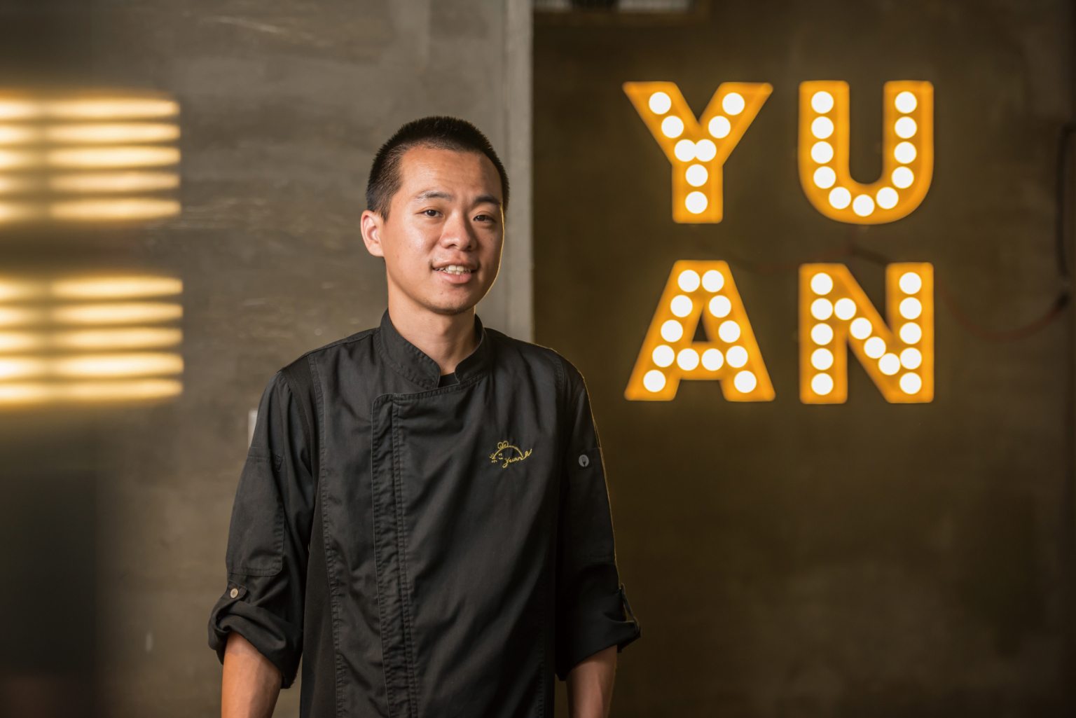 「上午當農夫,晚上當廚師」這兩種截然不同的職業,元Yuan的老闆兼主廚蕭淳元(阿元)卻樂在其中、游刃有餘。低調的黑、灰色調,藏身於大墩十七街住宅區內的餐廳,沒有醒目的招牌指引,但在進門後,眼前景象丕變,長長的吧檯座位區後方是開放的廚房,師傅們的一舉一動都成為流動的風景,看他們穿梭其中烹調食物、盛盤裝飾等等,都讓候餐過程不無聊,阿元笑說:「我覺得這樣可以跟客人近距離接觸,客人也對料理過程一目了然,吃得更安心。」