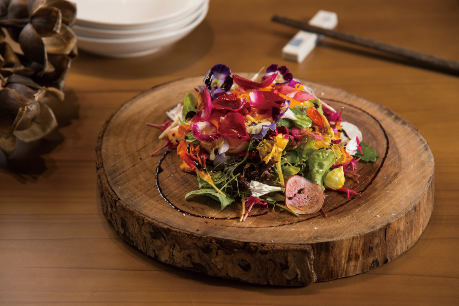 套餐的「阿元花園沙拉 蕃茄 春季水果」就可嘗到30多種在地栽培的食用花卉及野菜,花團錦簇、色彩繽紛,美得像看到了微縮版的迷你花園。阿元逐一介紹:「這是埔里的山形玫瑰,這是帶有青蘋果味的金魚草,還有鳳梨鼠尾草、三色堇、繁星花、秋海棠……。」在幕斯泡泡及巴薩米克醋的點綴及提味下,入喉清爽,口感豐富。