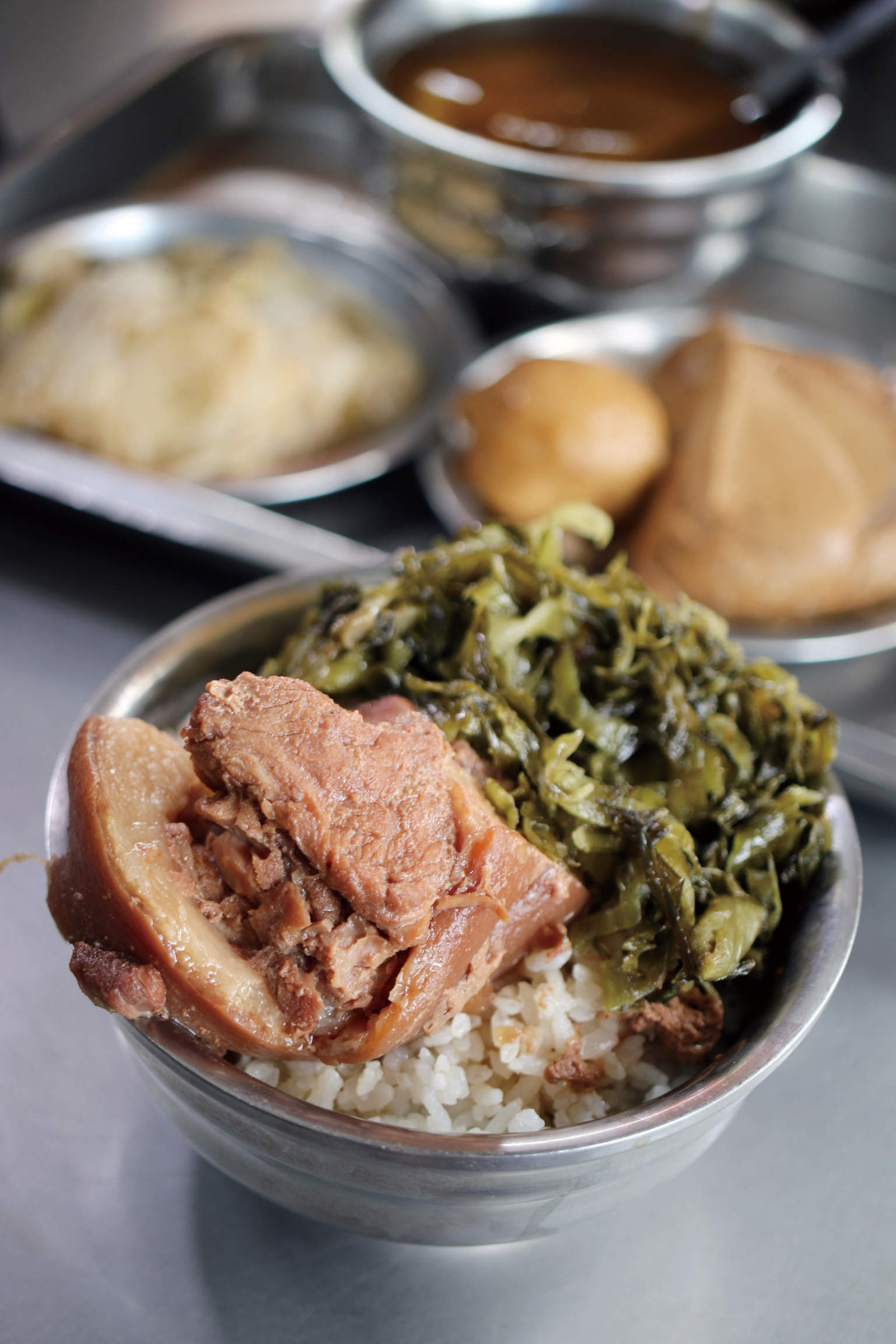 從清晨5點開始營業,人潮就絡繹不絕上門,排隊等點餐。金針湯、味噌湯、紫菜湯一律10元,先選擇自己喜愛的湯品,放在托盤上,再點選爌肉飯或豬腳飯,緊接著拿起筷子在飯碗上堆起滿滿的酸菜,再點白菜滷、筍絲或滷豆腐、滷丸等小菜,豐盛的一餐大約只需百元,俗擱大碗的庶民美食,是受歡迎的主要原因。招牌爌肉選用腳庫肉,以大川醬油滷得油油亮亮,入味十足且甘甜軟嫩,即使是肥肉部位也絲毫不膩口,讓人忍不住就多扒了好幾口飯。