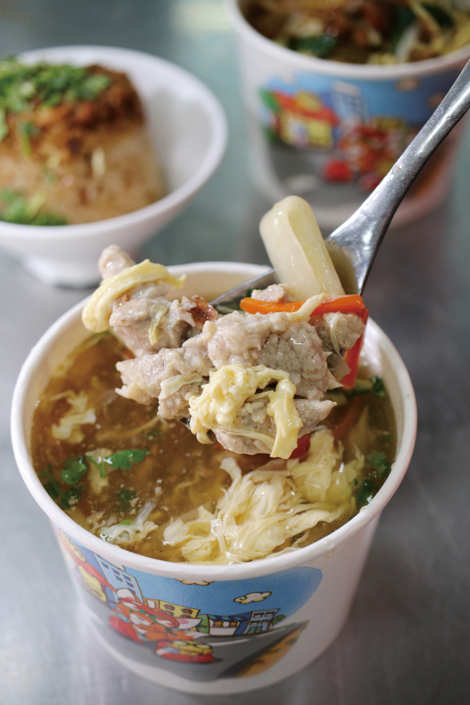 「我常對兒子說,做人要為別人想,不要只為自己想。」端出招牌的肉粳湯,老闆娘呂閨秀分享起她的經營哲學。基於這樣的想法,她手中捏製的肉粳特別講究真材實料,選用高品質的魚漿及溫體豬的腿肉,並以全蛋取代粉類,現點現做端出口感佳、香氣足的美味肉粳,粳湯並加入滿滿的筍絲及蛋花,香滑好滋味讓人一吃上癮。再搭配一份選用圓糯米蒸出的筒仔米糕,更是在地人激推的老饕吃法。