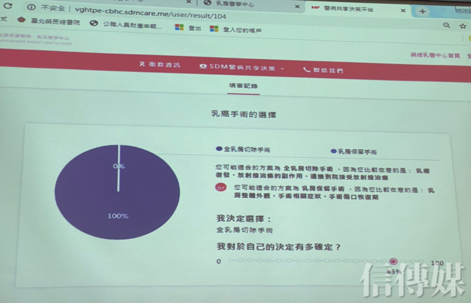 收治陳小姐的台北榮總乳房醫學中心主任曾令民指出,經醫病共享決策樹(SDM Tree),充分了解各種治療的選擇及優缺點,以及自己最在意的部份,在與家人、醫師共同討論後,陳小姐改以先化療、再局部切除方式保留左乳,術後癌細胞獲得控制,對於治療結果也十分滿意。