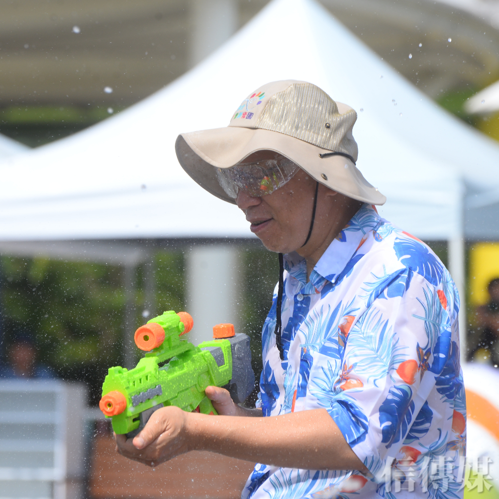 台北市長柯文哲於揭幕儀式手拿水槍,跟著小朋友一起玩起打水仗。(攝影/趙世勳)