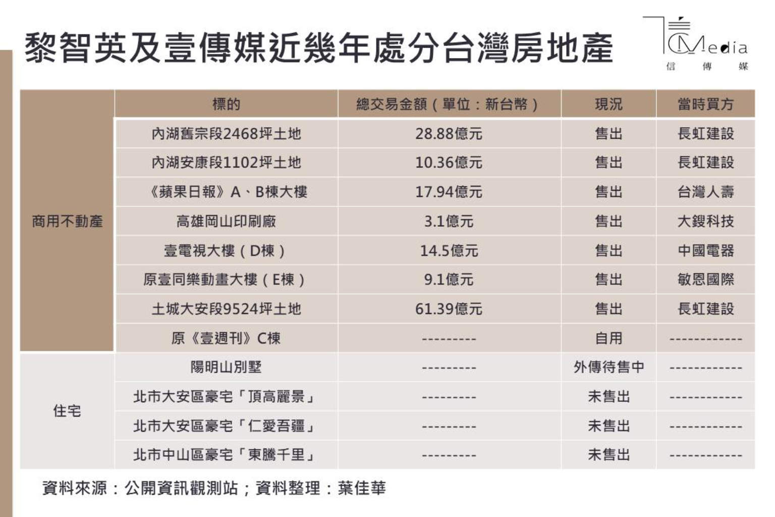 「雖然媒體業虧錢,但是房地產卻是大賺。」一名房地產市場人士分析,2002年黎智英剛進軍台灣媒體業,當時內湖區仍還在發展階段,就逢低買進重押北市內湖,不僅以個人投資公司名義購入內湖工業區土地,也自建辦公大樓供《蘋果日報》、《壹週刊》、壹電視使用,研判黎智英個人與壹傳媒當時手上應持有上萬坪,如今順利脫手的標的幾乎都是大賺。