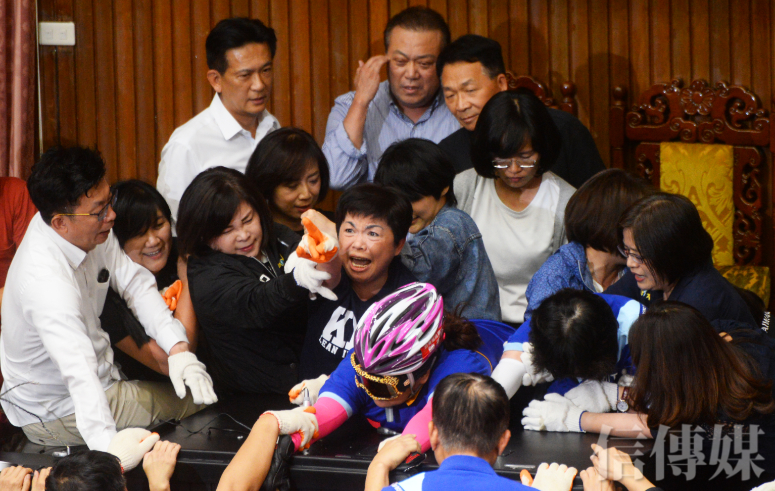 而這些綠委對陳玉珍發動數波拉人攻勢,但始終都無法撼動陳玉珍。有幾度陳玉珍甚至整個身體都被抬離桌面,被架在半空中,但她的雙手始終抓緊不放,堅守在主席台。