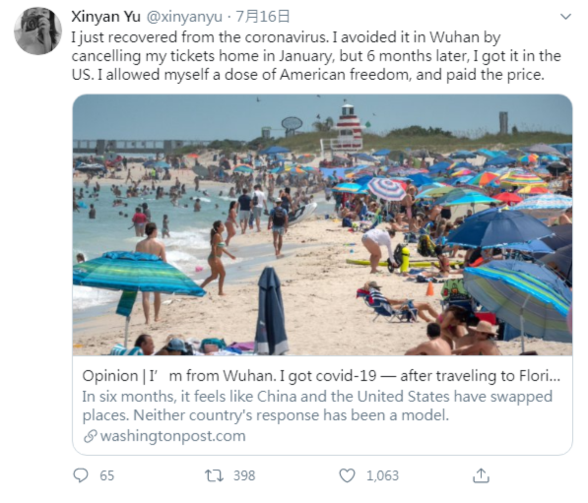 一個來自中國武漢的記者,到美國佛羅里達州旅行後感染新冠病毒(covid-19,武漢病毒),她投書《華盛頓郵報》,寫下染疫的經歷,比較美中兩種極端的防疫措施,確診10天後她還高興地跑去看美國7月4日國慶煙火,顯然她還挺享受美國自由自在的軟性防疫措施,沒有埋怨美國政府。