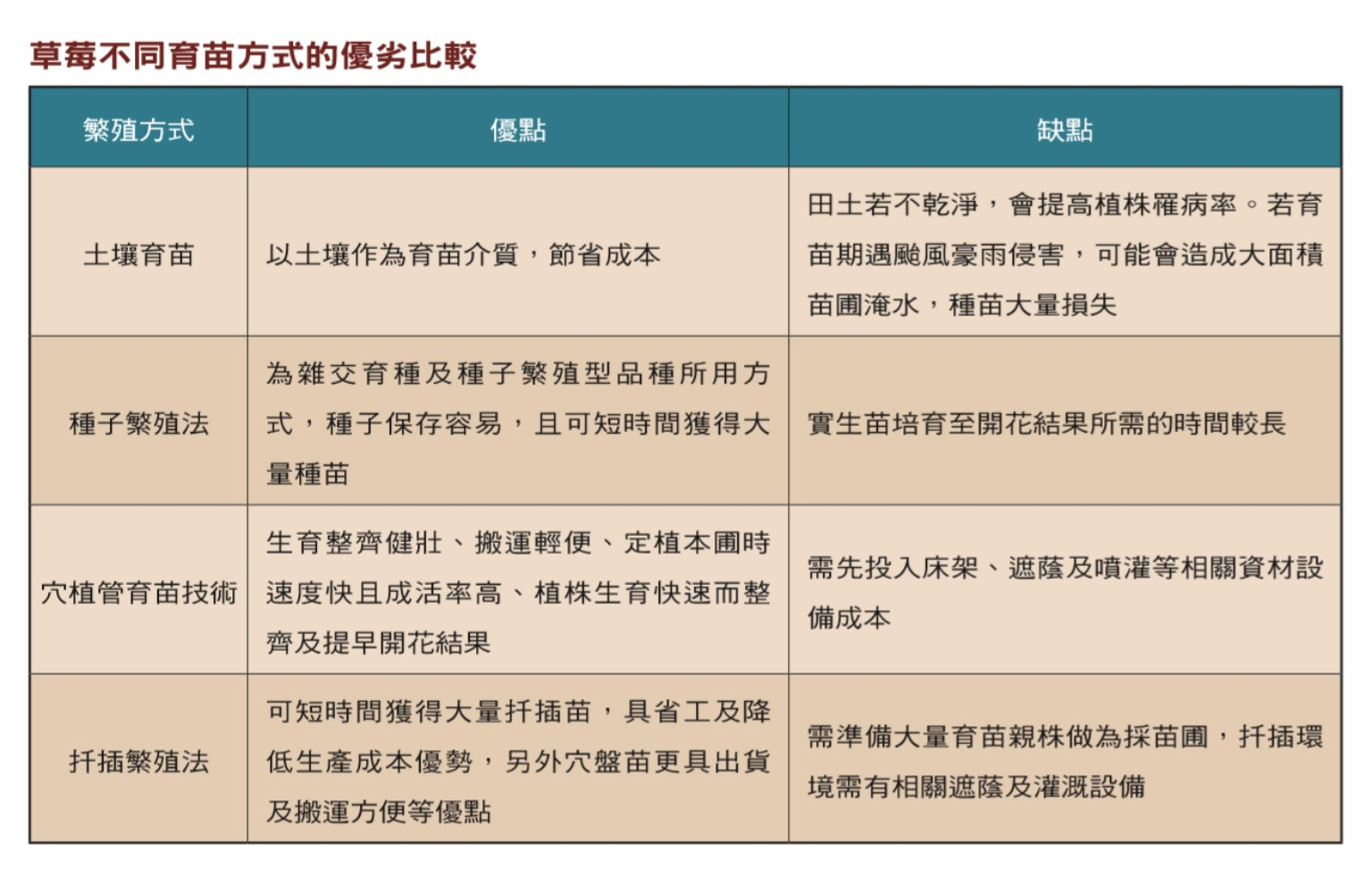 臺灣草莓產業栽培面積約500公頃,種苗年需求量約2,500萬株以上,每年種苗需重新培育,種苗產值超過2億元以上。種苗為產業發展的根本,種苗的健康與否,對單位面積產量、生產成本及收益影響甚鉅,臺灣草莓種苗生產現仍以農民自行培育為主,但因育苗期長且夏季高溫潮溼,更增加農民自行育苗的困難度。2015年就曾因種苗感染病害,發生缺苗400萬株以上的窘境,造成栽培面積銳減,農民損失慘重。本文就草莓育苗繁殖方法及穴植管育苗技術進行說明,提供有意育苗及育種的農友參考。