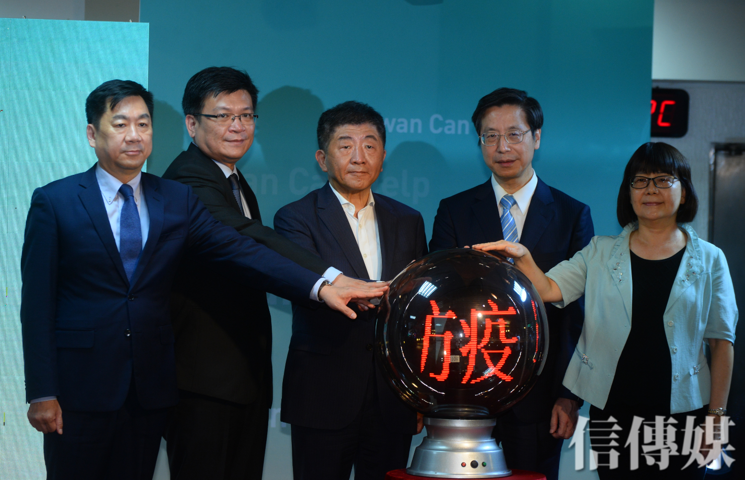 中華郵政發行防疫郵票,邀請衛福部長陳時中(左三)與防疫五月天成員一同見證歷史。(攝影/趙世勳)