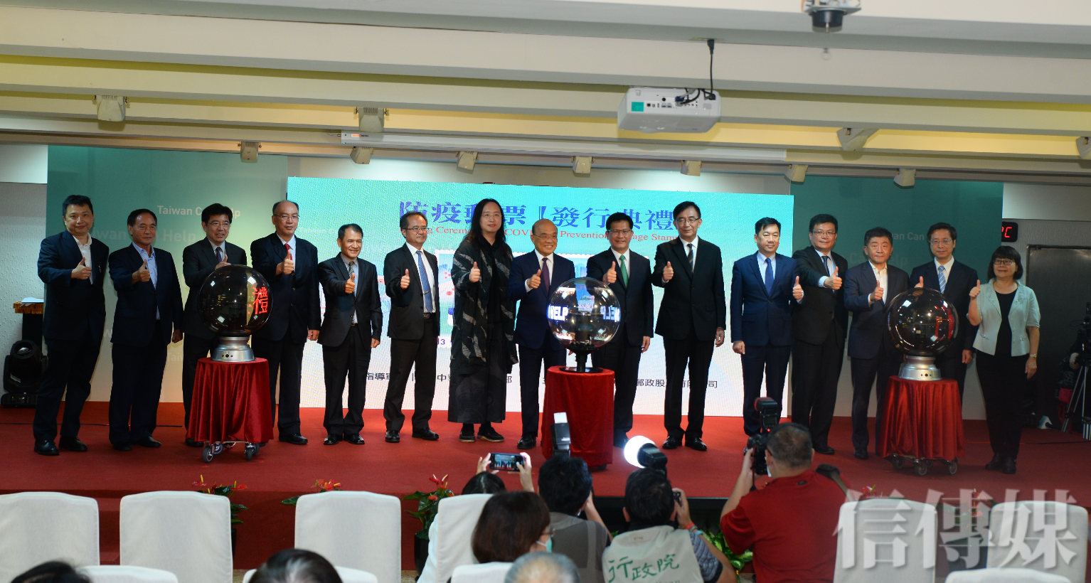今(21)日中華郵政發行防疫郵票,行政院長蘇貞昌、政務委員唐鳳及交通部長林佳龍等出席防疫郵票揭幕典禮。(攝影/趙世勳)
