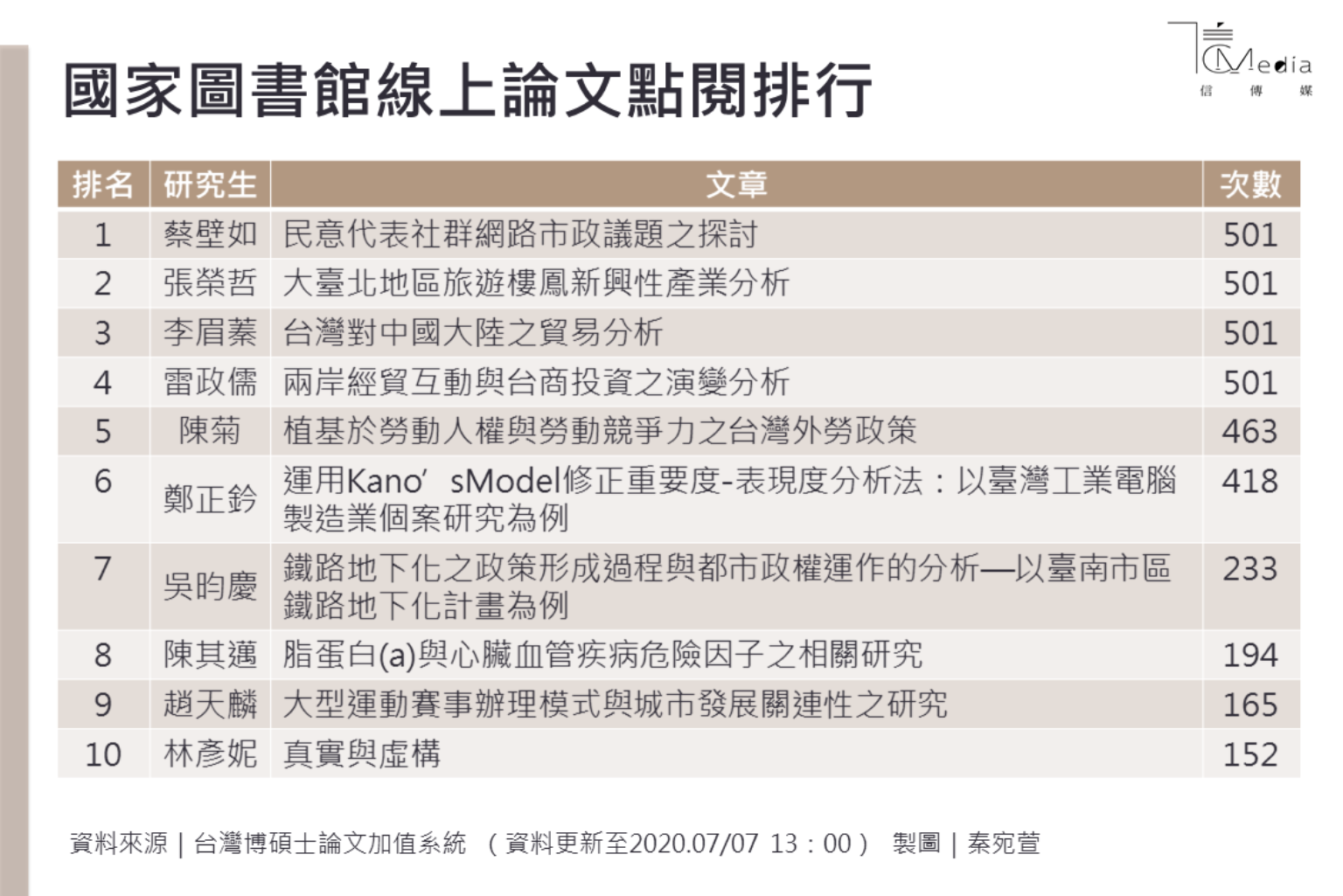 5到10名則有準監察院長陳菊、國民黨立委鄭正鈐、民進黨高雄市長補選候選人陳其邁,高雄市議員趙天麟的論文,排名第10的論文作者為林彥妮,指導教授是前行政院長江宜樺。