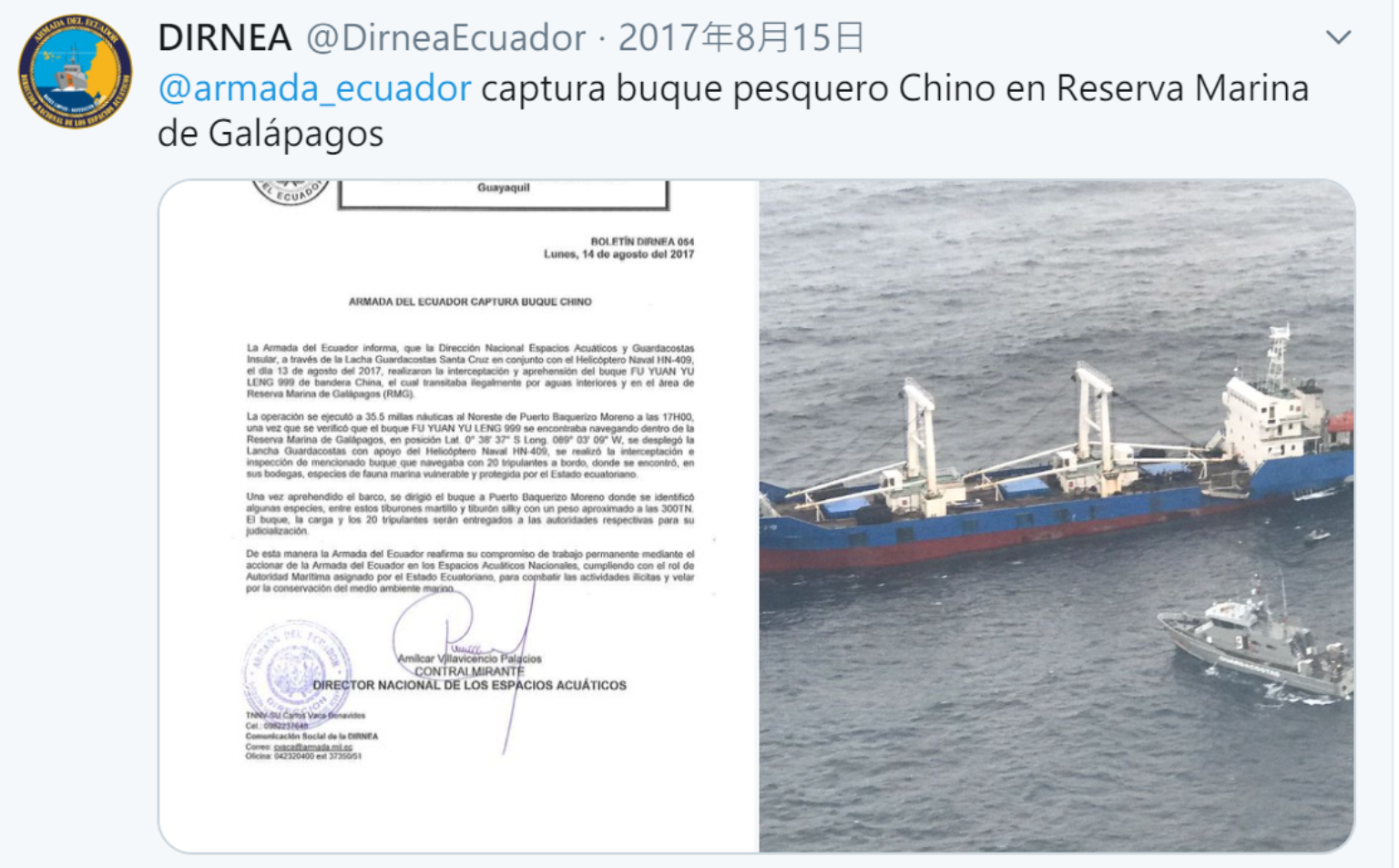「我們會從區域層級捍衛加拉巴哥群島海洋保護區的EEZ」中國已連續4年來到此進行遠洋捕撈,厄瓜多總統莫雷諾(Lenin Moreno)在推特宣布政府將與專家合作,制定保護群島與海洋資源的策略。