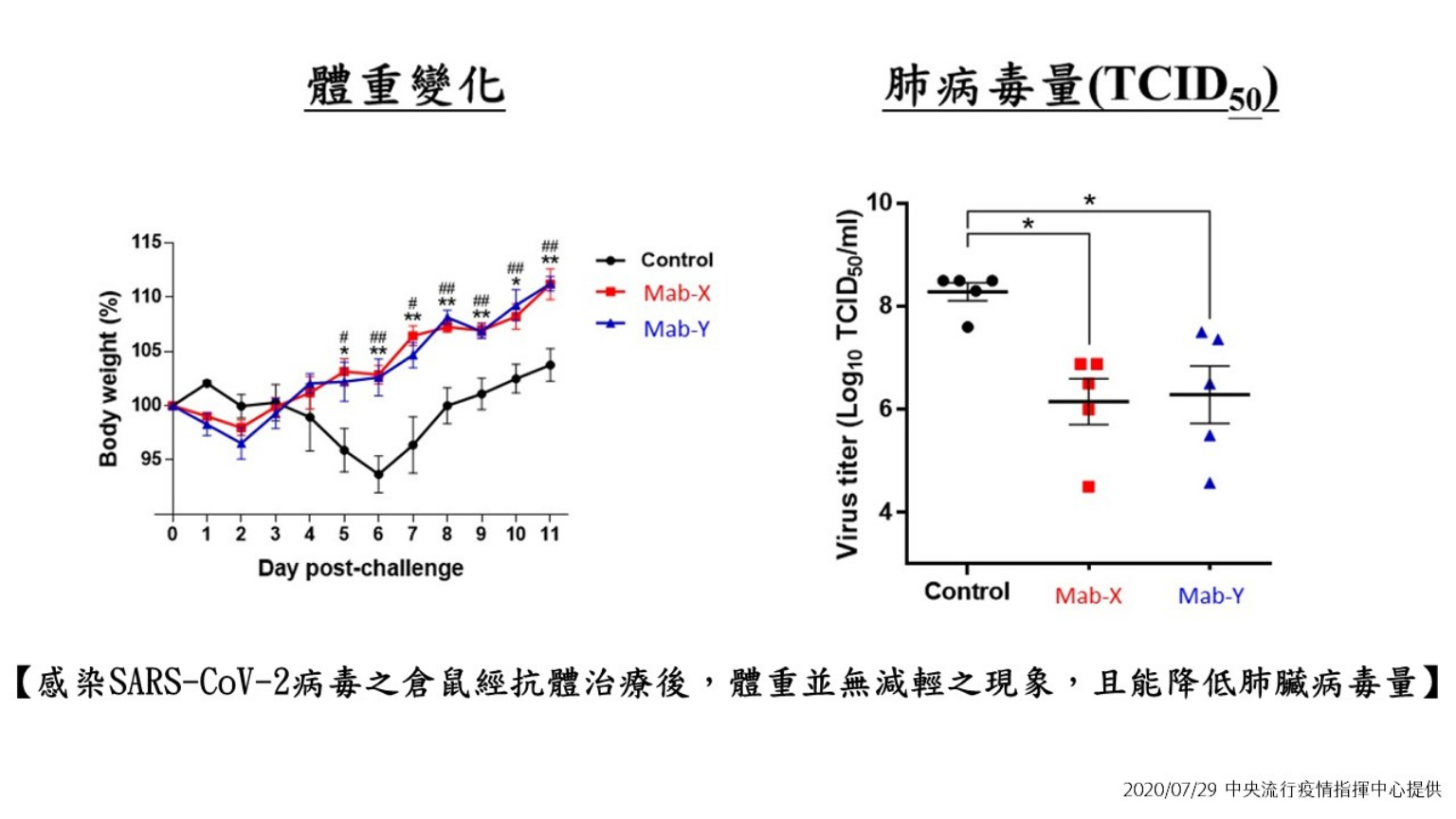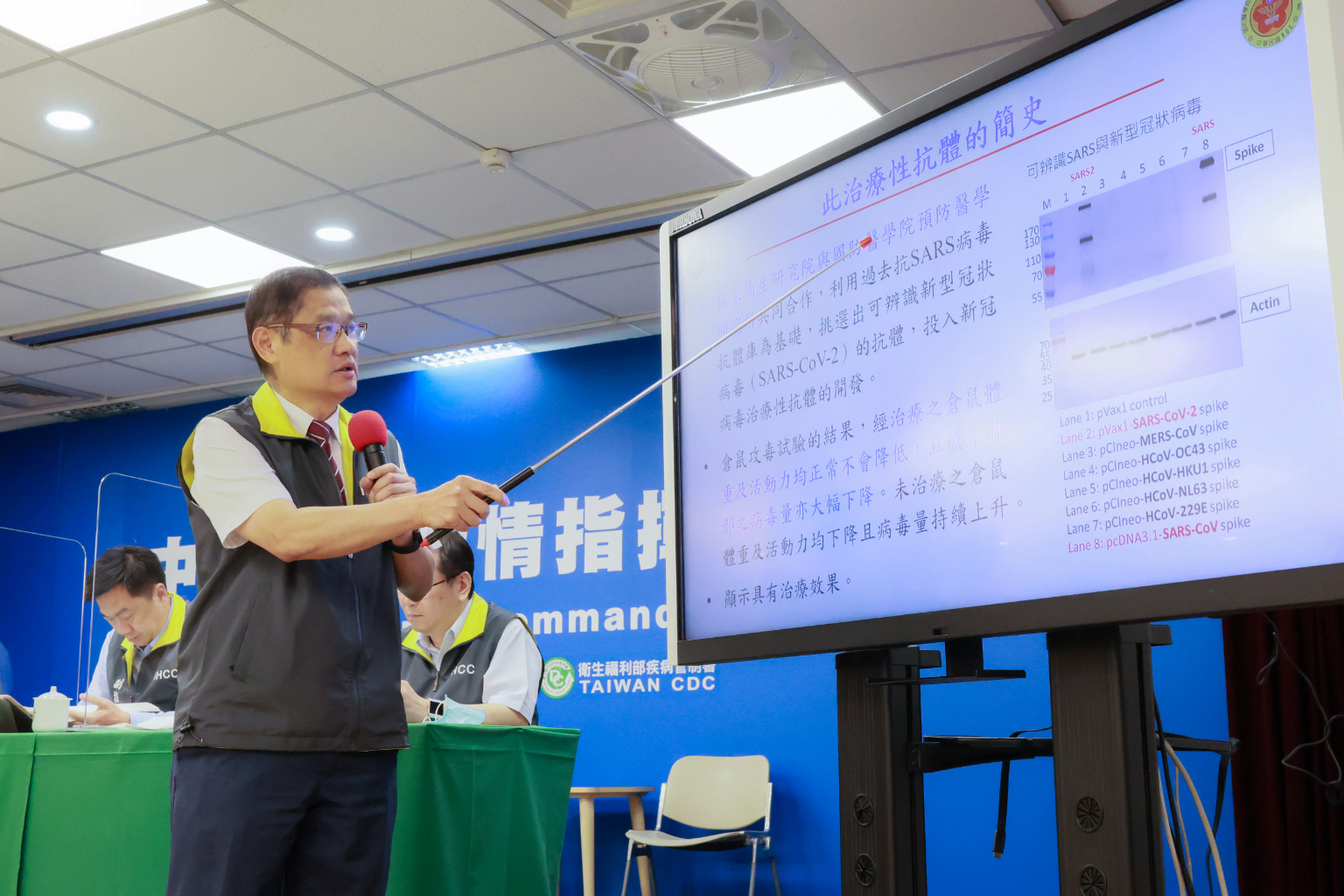 國衛院感染症及疫苗研究所所長廖經倫,也在今日記者會中表示,國衛院與國防醫學院預防醫學研究所共同合作,以過去抗SARS病毒抗體為基礎,挑選出可辨識新型冠狀病毒(SARS-CoV-2)的抗體,投入新冠病毒治療性抗體的開發工作。研究團隊運用治療性抗體來治療感染新冠病毒的倉鼠,廖經倫表示,「經動物試驗的結果發現,倉鼠的體重、活動力不會因此降低,肺部病毒量卻大幅下降,其對抗新冠病毒的治療效果令人振奮。」