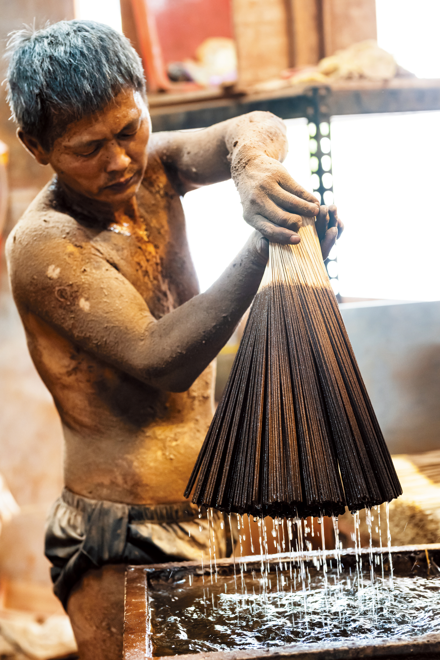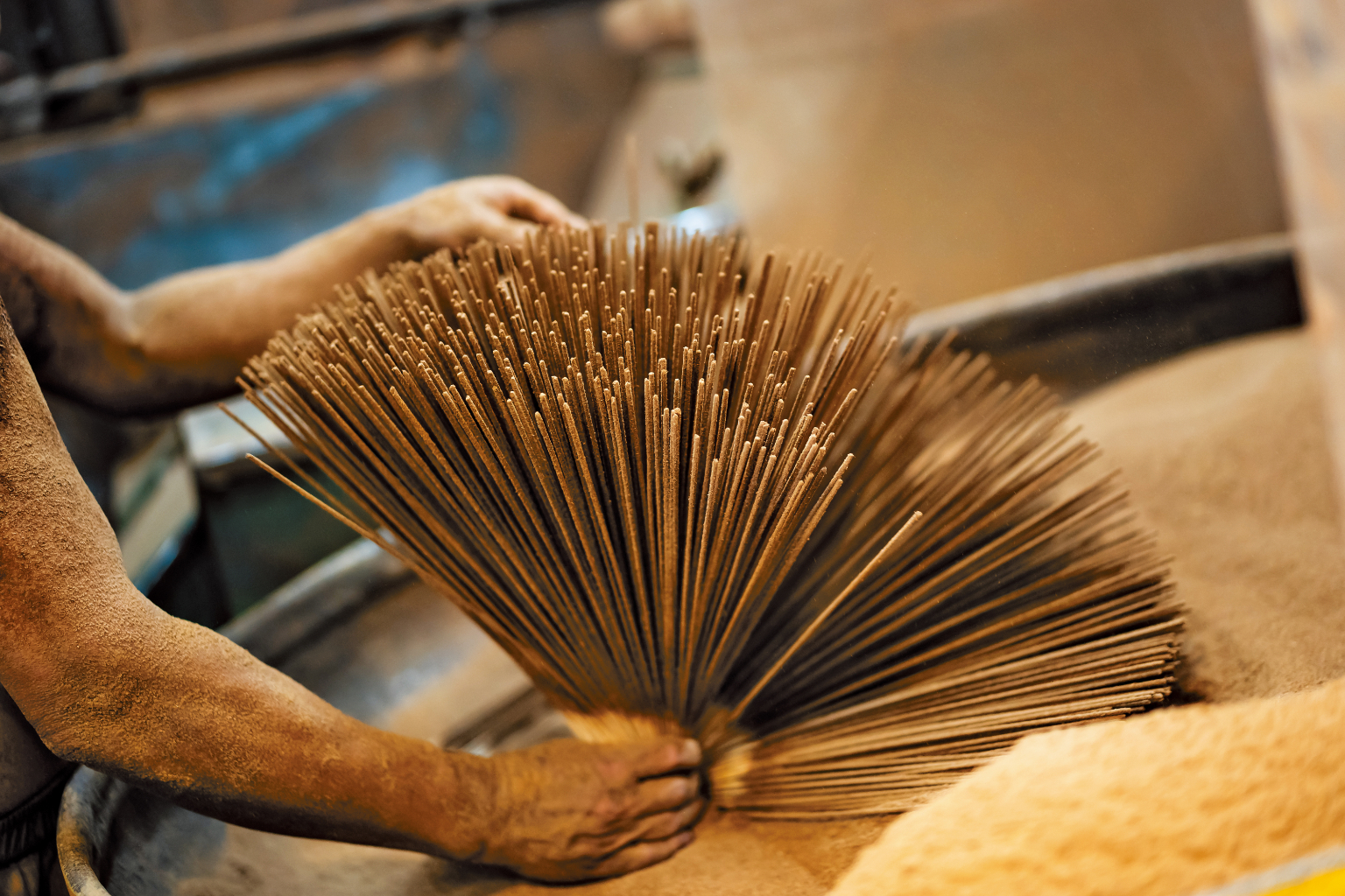 還沒進入己文堂,就被沉穩的香氣安定了心神。燠熱無風的製香室內,打赤膊的師傅們熟練地拿起大把香枝,浸水、蓋粉、展開如煙花。「剁!剁!」敲抖香枝的過程香粉飛揚,黏上師傅汗溼的結實臂膀,縱使一天下來全身是粉,彷彿十八銅人,他們依然確實做好每道工序,眼神盡是專注。