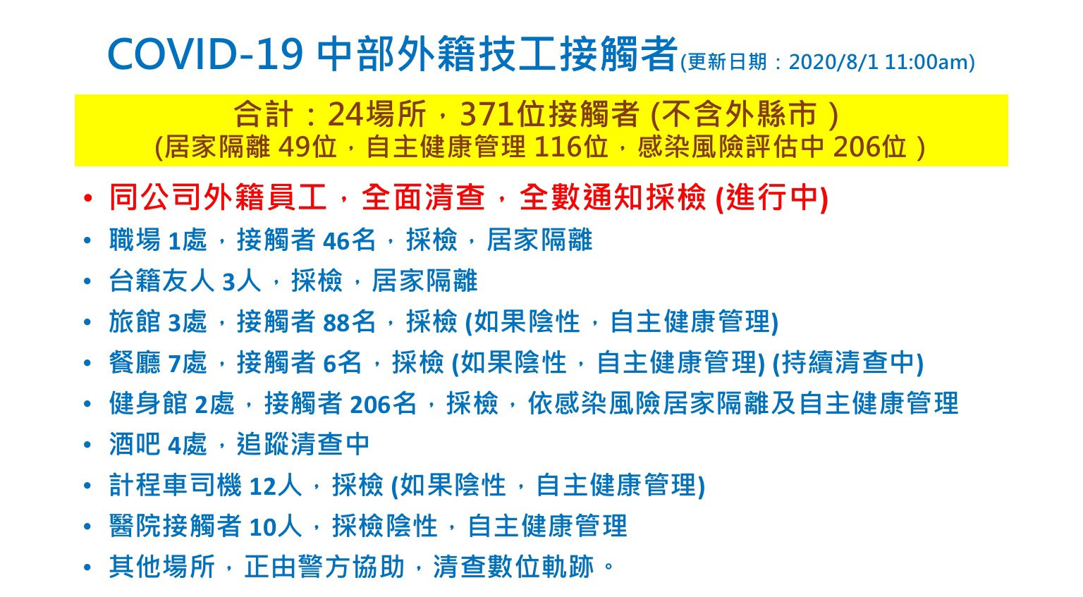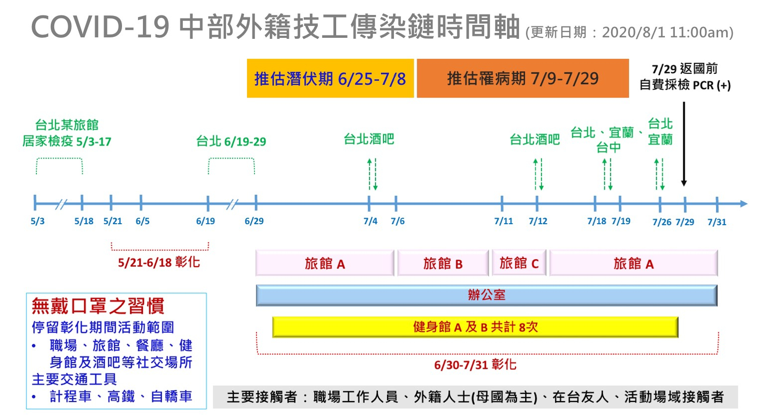 案471為本國籍,1月8日出境至菲律賓經商,因有慢性疾病安排返台就醫,7月10日出現咳嗽、腹瀉,28日入境時機場採檢陰性,因症狀持續且有慢性疾病,至醫院負壓隔離病房治療,經醫院採檢2次,於今日確診。接觸者6人皆居家隔離中。