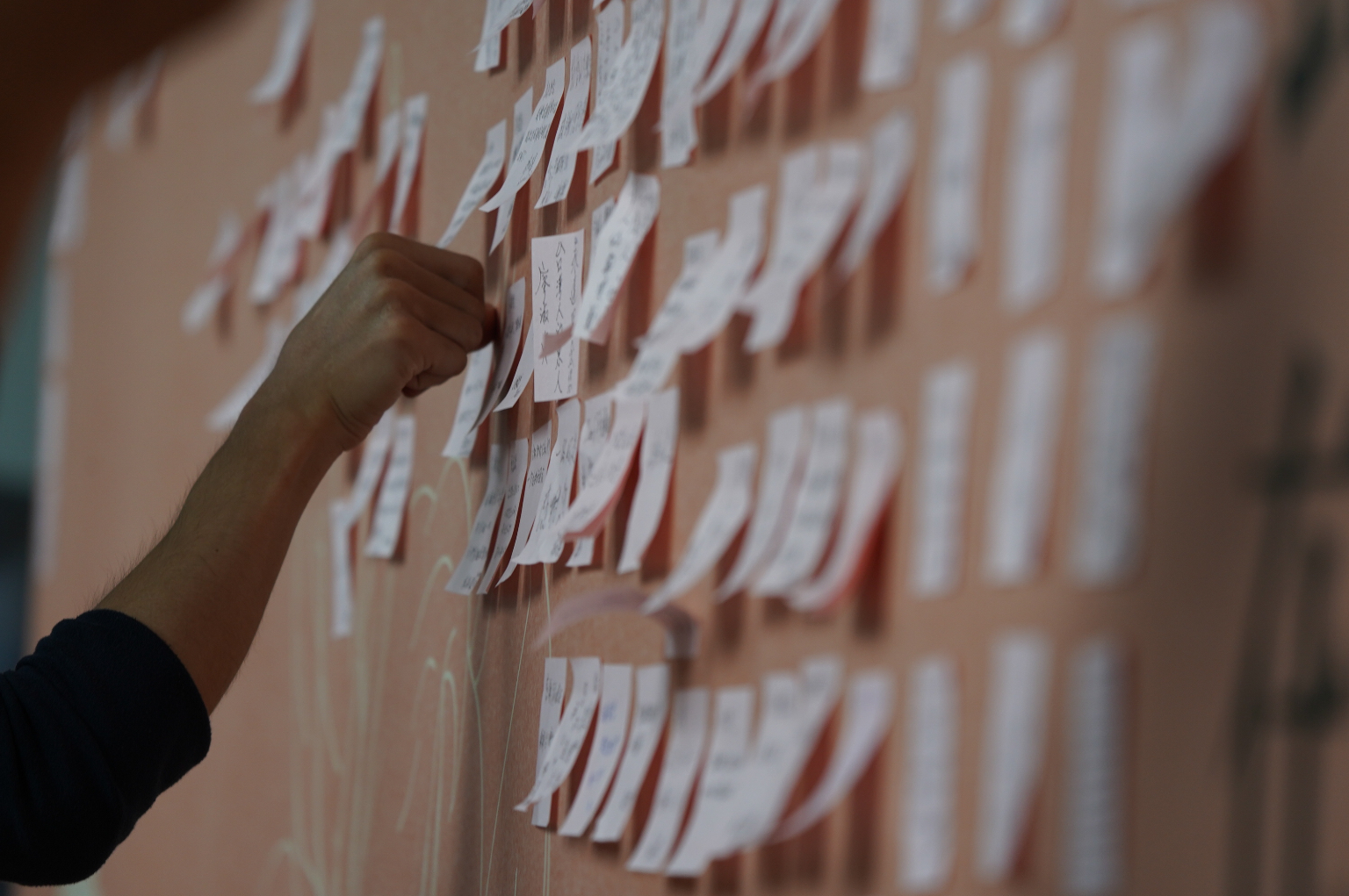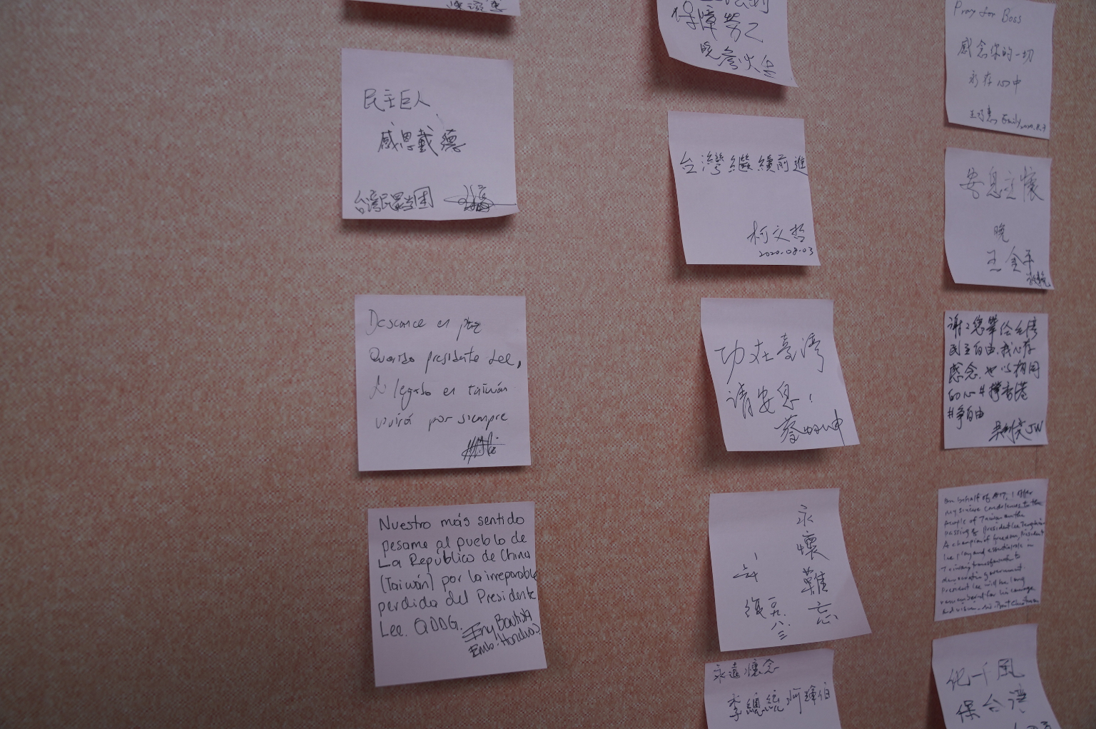 追思會場外的李登輝前總統名言「民之所欲、長在我心」追思牆,上頭滿滿的是民眾以及政要人士留下的親筆祝福與追思。