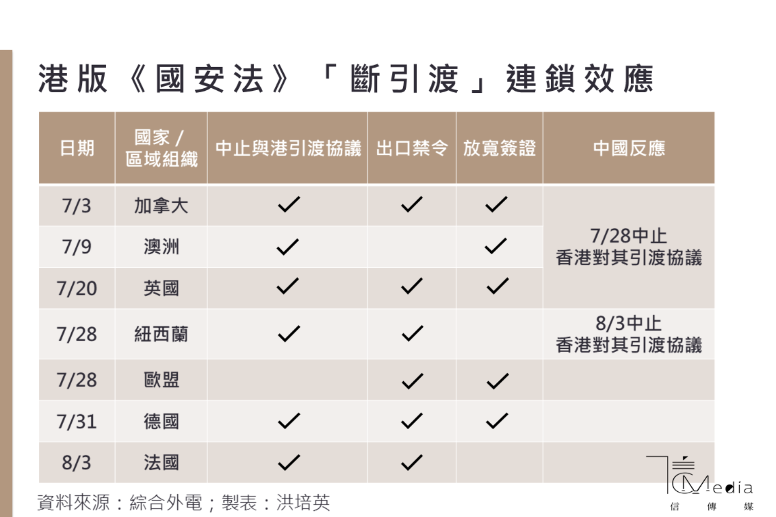根據《法國24台》(France 24)報導,8月3日法國宣布暫停批准與香港的引渡協議,也就是說,已有6國正式停止對港引渡。