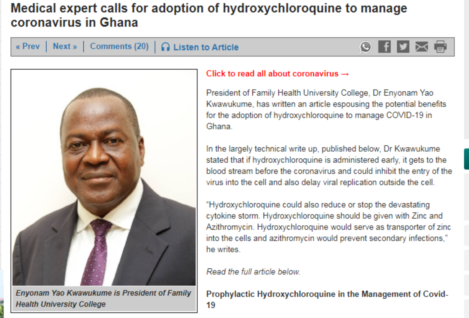 迦納的家庭健康大學學院院長Enyonam Yao Kwawukume博士寫一篇文章,推廣國民採用羥氯奎寧控制新冠病毒,有許多潛在好處。