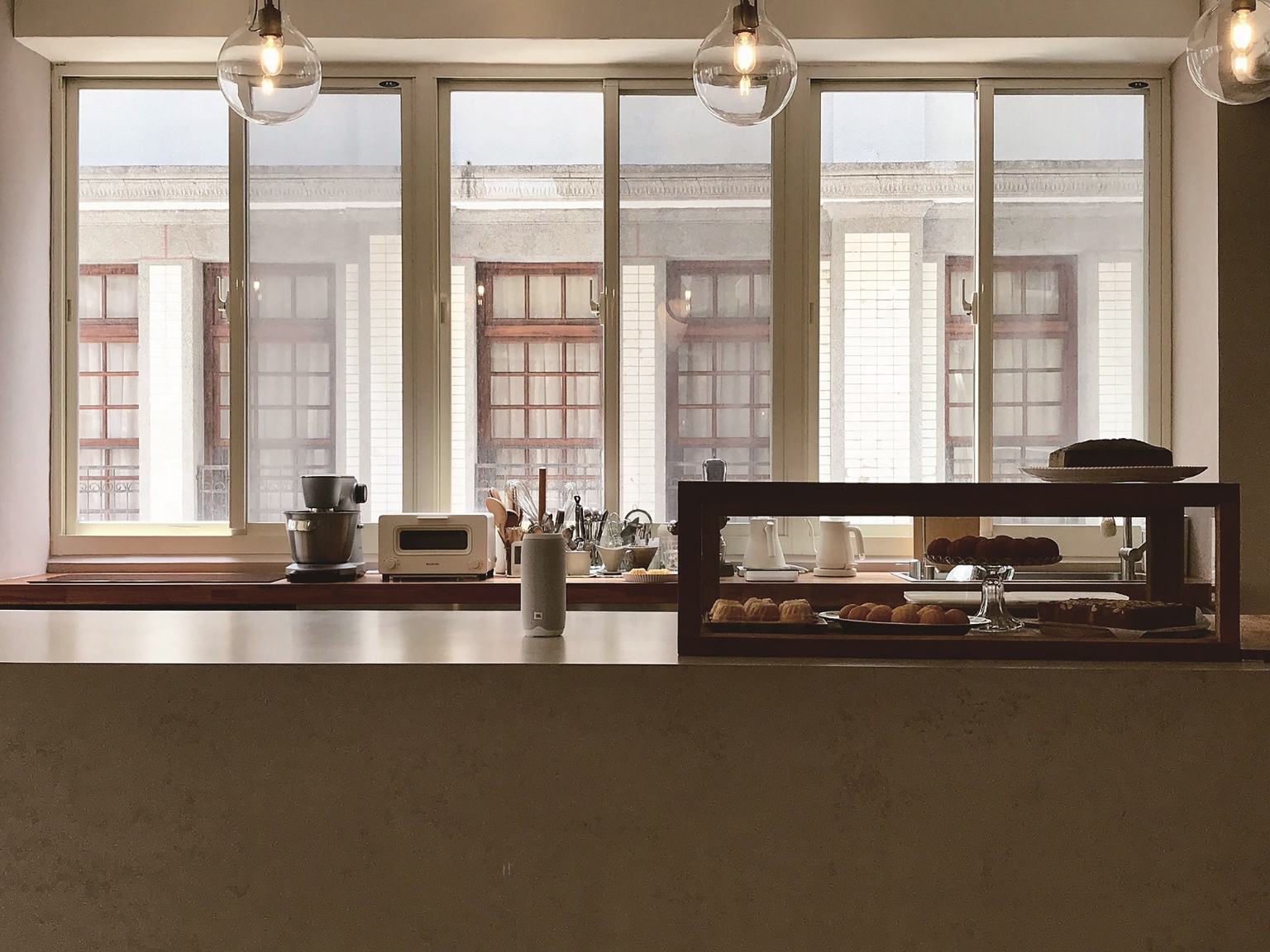 Karen 相當喜歡位於延平北路二段2樓的點心專賣店「HERE & THERE」,店內的大面玻璃窗,無論晴雨都能引入不同光線,以自然光決定室內氛圍。當視線穿過窗外,還能直接看到大稻埕復古而懷舊的建物立面,讓每一幕窗景都成為室內空間最好的端景。