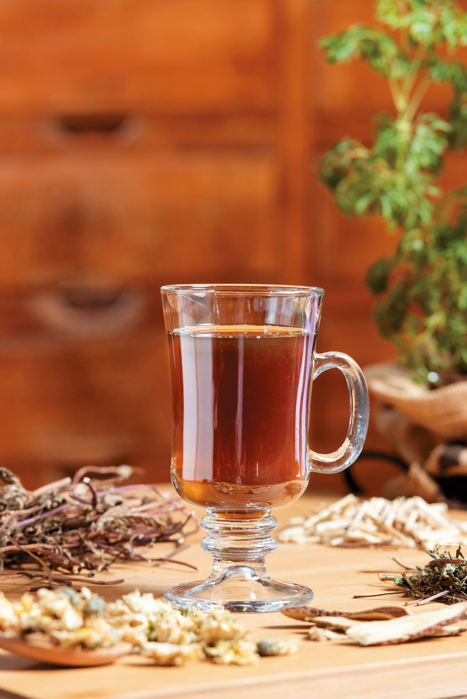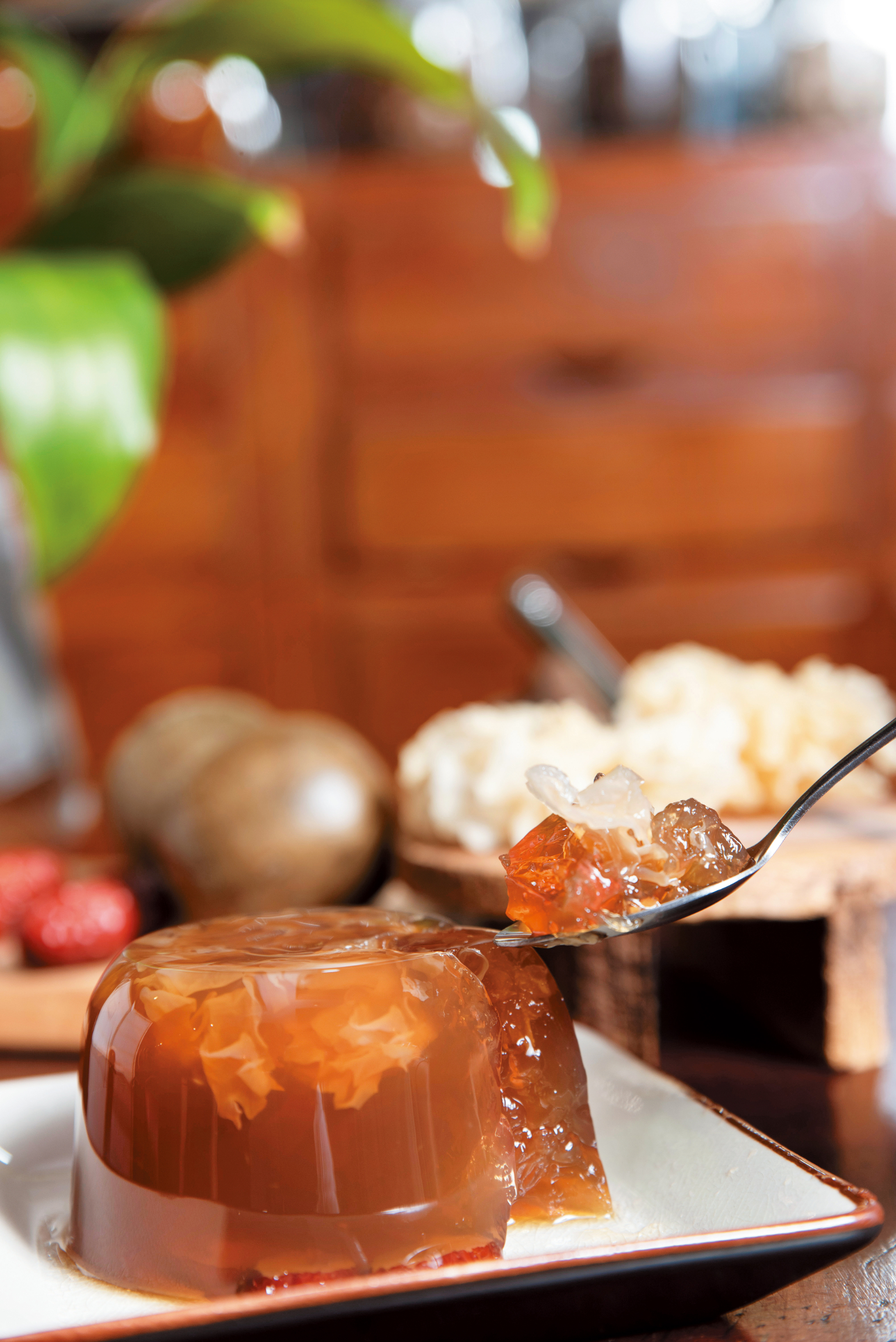 當然非八寶茶莫屬,包括黃耆、紅棗、蔘鬚、龍眼肉、甘草、陳皮、麥門冬、菊花,共八種中藥材,其中像菊花清香、陳皮濃郁,堆疊出豐富層次,而紅棗、甘草、龍眼肉則帶甜回甘,不需要額外加糖,就能品嘗到甘美口感,「熱熱喝或冷泡都可以,很多上班族女生都喜歡喝這個代替手搖飲料。」再加入湯圓、蜂蜜、白木耳等配料,就是一碗豐盛的下午茶甜品,也推薦將八寶茶當成湯底,熬煮排骨湯時加入一帖,熱度可將藥材風味完整釋放,應用範圍相當廣泛。
