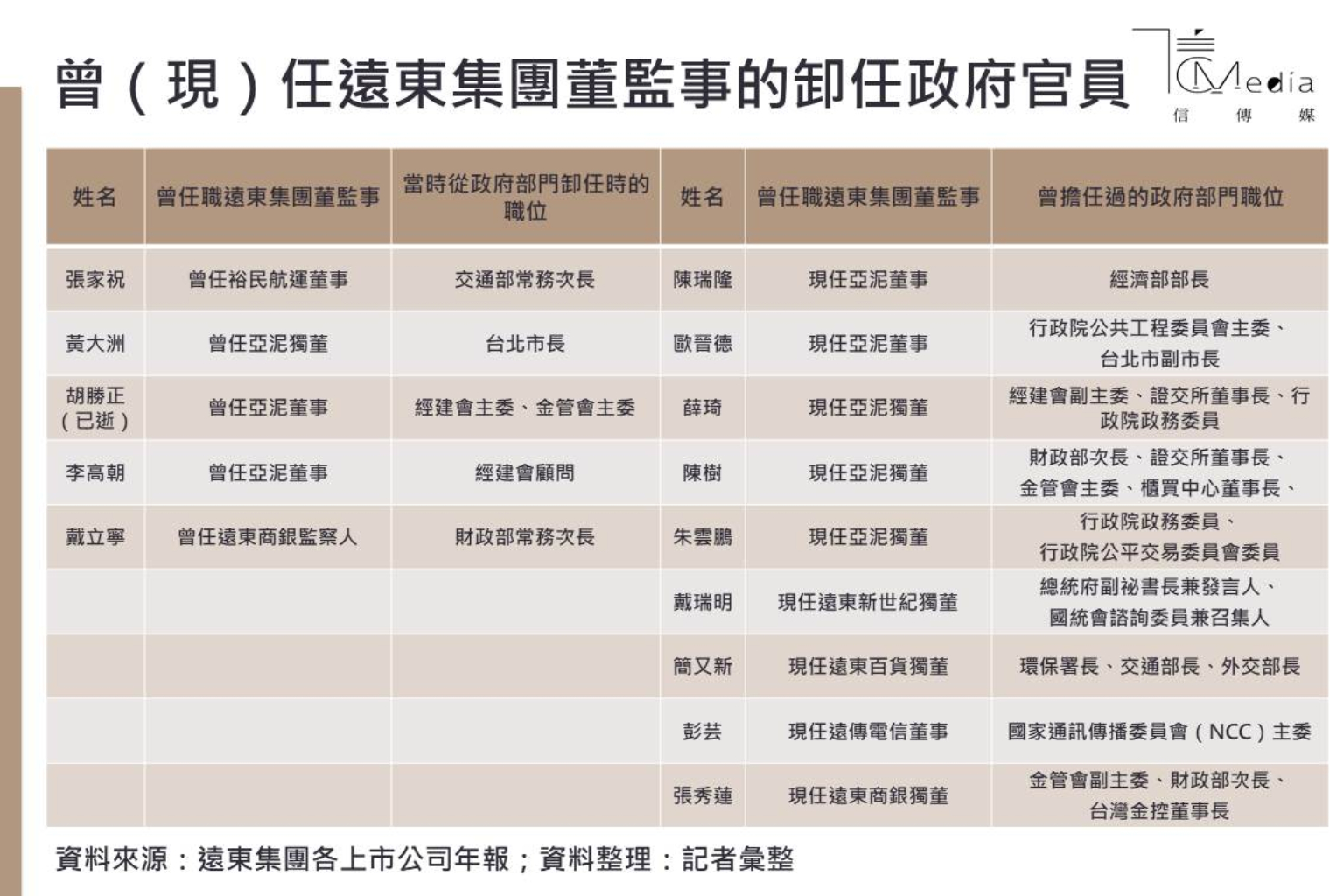 另外,在馬英九總統任內擔任財經智囊團之一的前行政院政務委員朱雲鵬,目前是現任亞泥獨董;前總統府副祕書長兼發言人戴瑞明為現任遠東新世紀獨董;前環保署長、交通部長、外交部長的簡又新則是擔任遠東百貨獨董。當然也包括,前NCC主委彭芸擔任遠傳電信董事 ; 曾任金管會副主委、台灣金控董事長的張秀蓮則是被延攬擔任遠東商銀獨董。