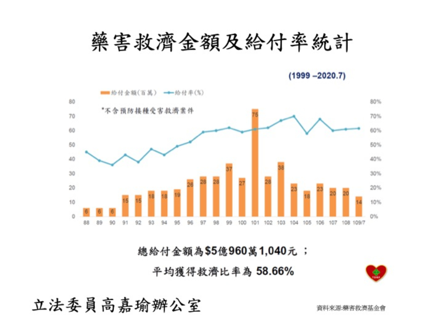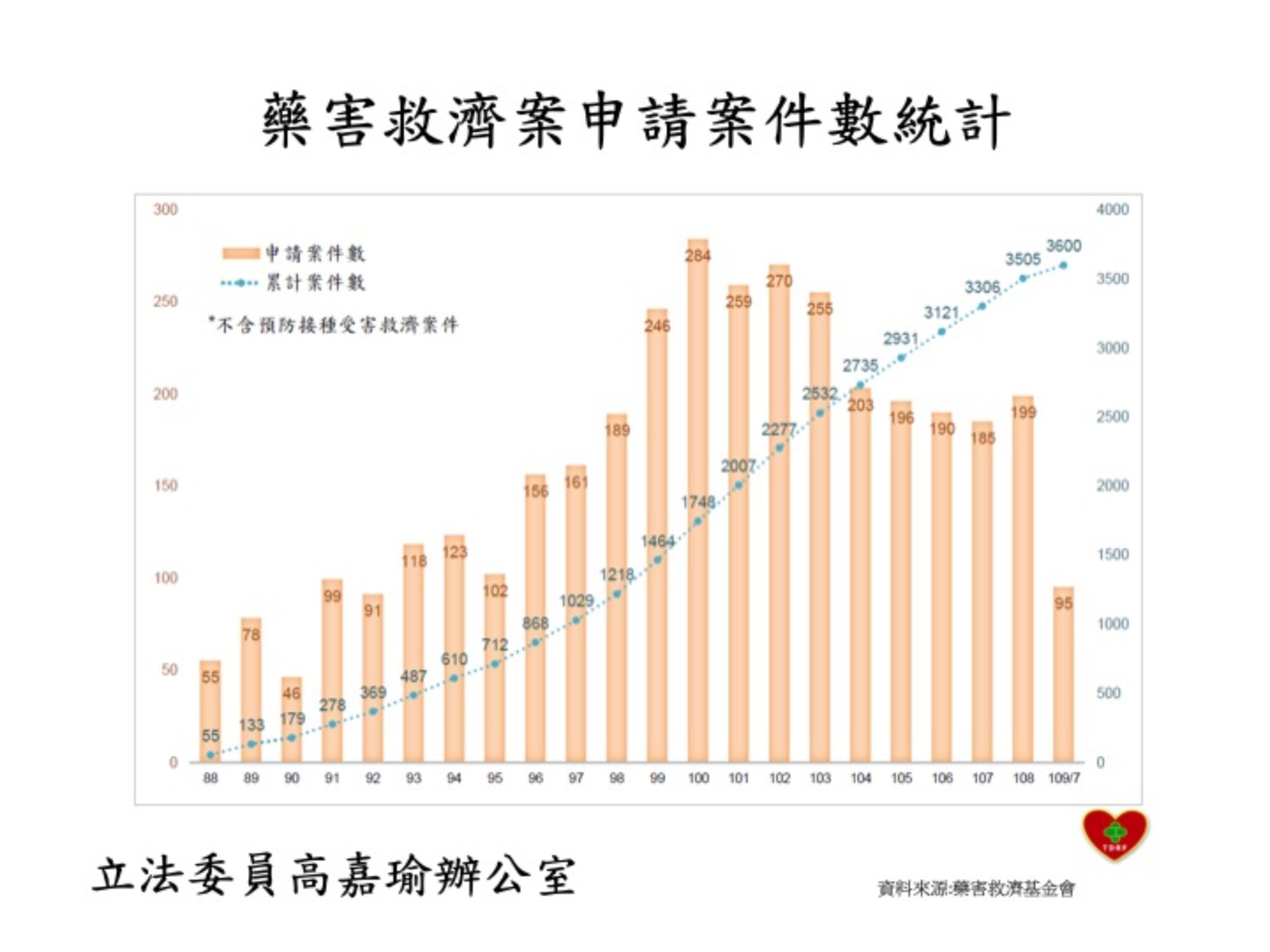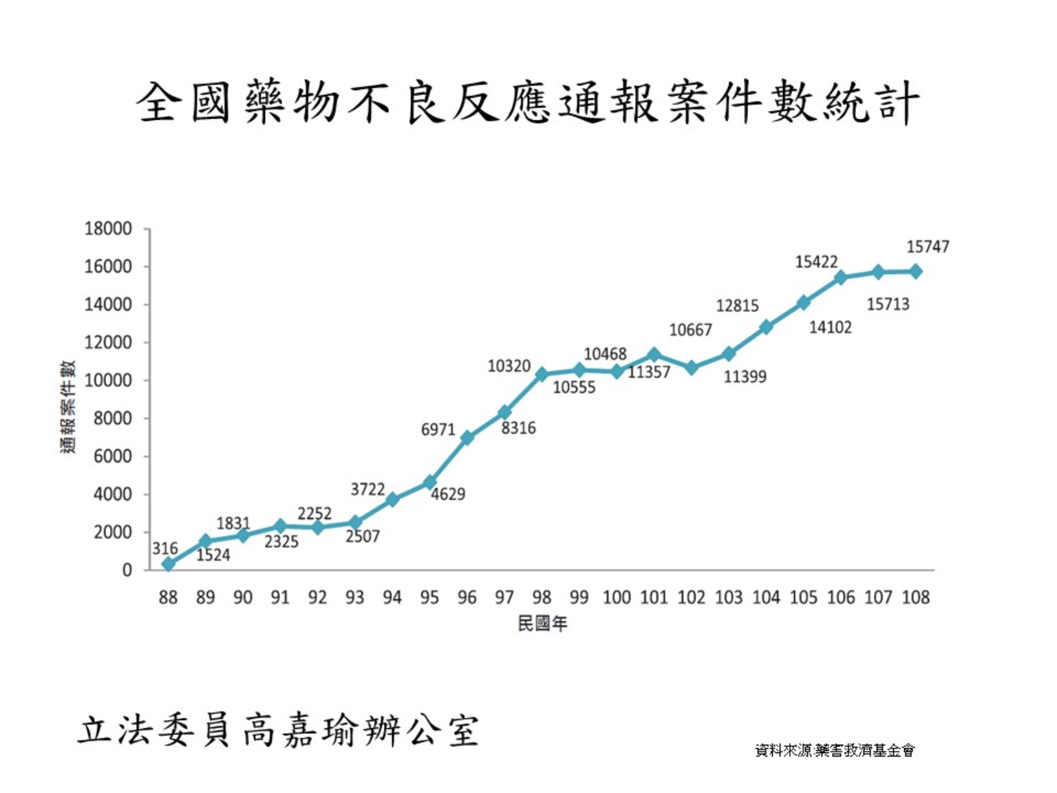 類似的案例,層出不窮。民進黨立委高嘉瑜召開記者會指出,依據藥害救濟基金會的統計資料,依據藥害救濟基金會的統計資料,藥品不良反映件數從民國87年迄今累積逾17萬件,而且從最初的316件,逐年升高,光是去年就超過1萬5千件;這些年來,藥害救濟申請案件數累計超過3600件,但是平均獲救濟比例卻僅6成不到,如此嚴重的藥害,獲救濟案件卻是寥寥可數。