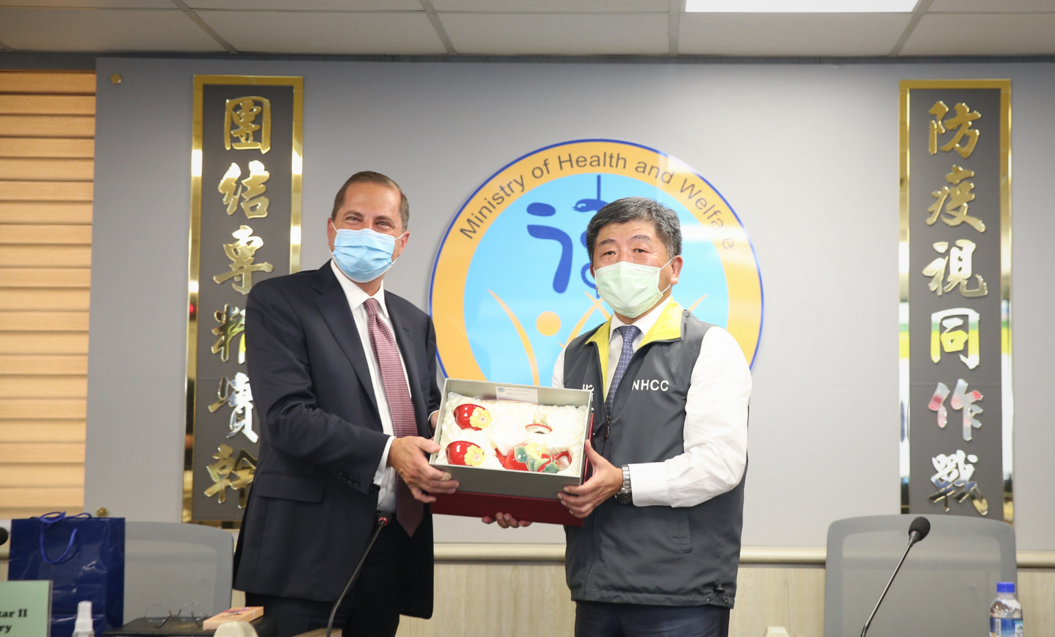 在外交部與衛福部共同努力下,今在衛福部部長陳時中及美國衛生部部長阿薩爾的共同見證下,由外交部台灣美國事務委員會主任委員楊珍妮(TCUSA Jen-ni Yang Chairperson)及美國在台協會處長酈英傑(AIT W. Brent Christensen Director)代表雙方於中央流行疫情指揮中心簽署「醫衛合作瞭解備忘錄」。