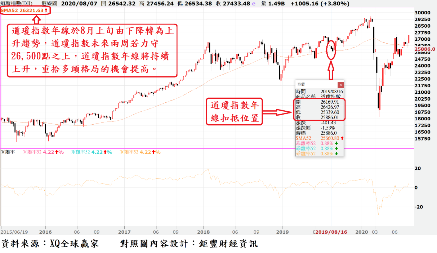 道瓊指數年線(52周均線)自3月中旬以來的下降趨勢,在8月首周再度轉為上升趨勢;S&P500指數離歷史高點僅1.2%咫尺之遙,年線穩定上揚;那斯達克、費城半導體指數8月首周同步續創歷史新高。