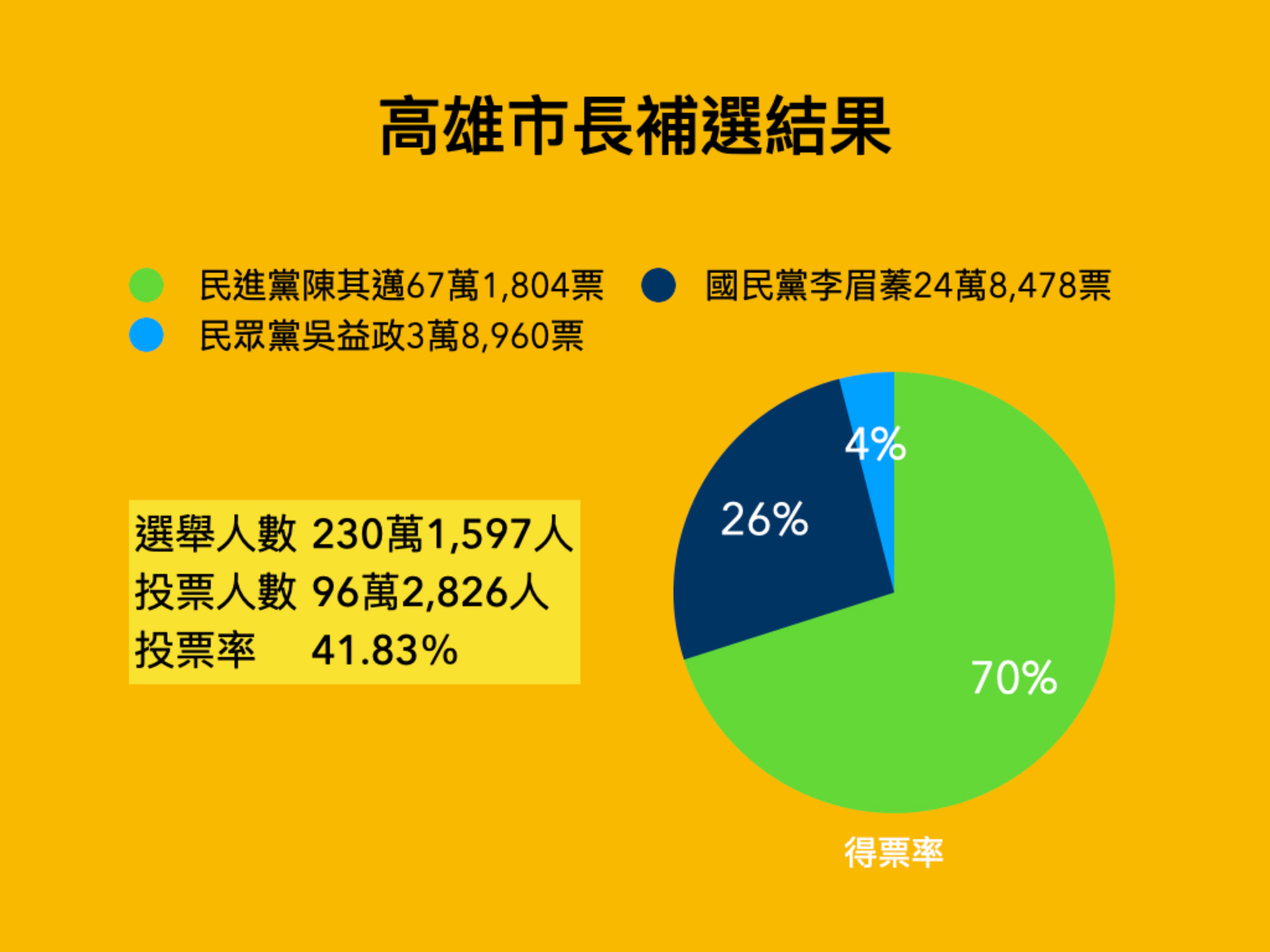 本次補選選舉人數為230萬1597人,陳其邁拿下逾67萬票、得票率約7成,得票率超越前市長陳菊第二任68%的得票率,寫下高雄市長選舉得票率新高。