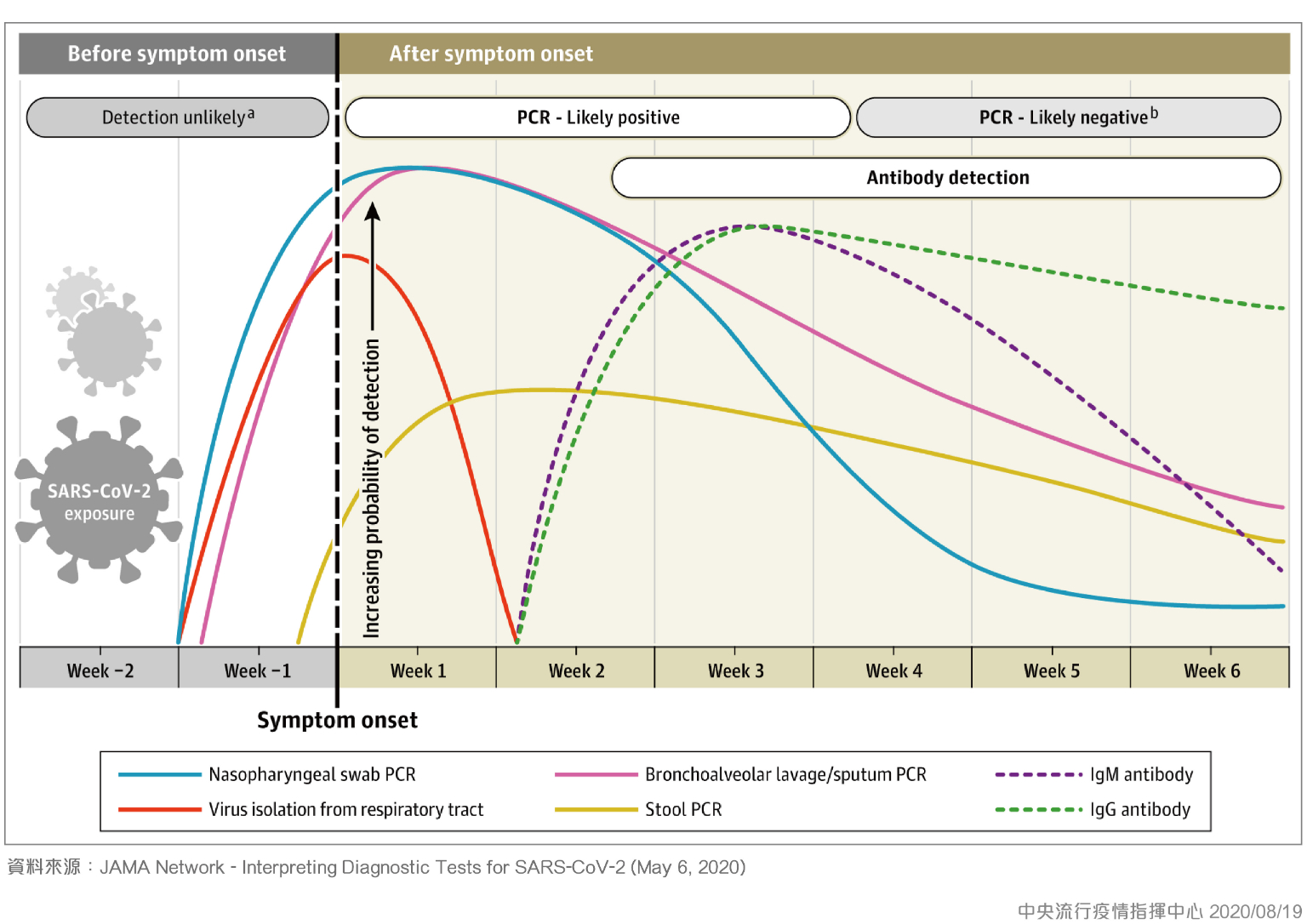 他也引用《JAMA》資料解釋,「中間紅色的線表示能分離出病毒的時候,等於是有症狀前1周到後1周,這段時間的病毒能被分離,比較具有傳染性。10天後,傳染性幾乎沒有了,所以才會14天居家檢疫若沒有病症,我們就會解隔離。」
