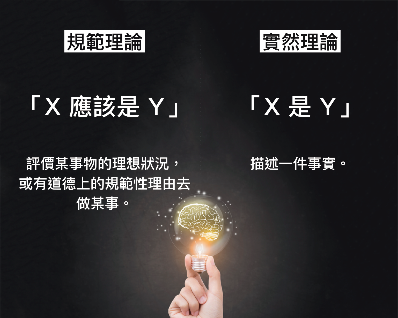 「做任何思考分析,要有兩套理論:規範理論與實然理論。實然理論從事實與因果關聯性,去分析各學說的優缺點;規範理論則用來決定在各有優缺點的時候,該如何選擇。」