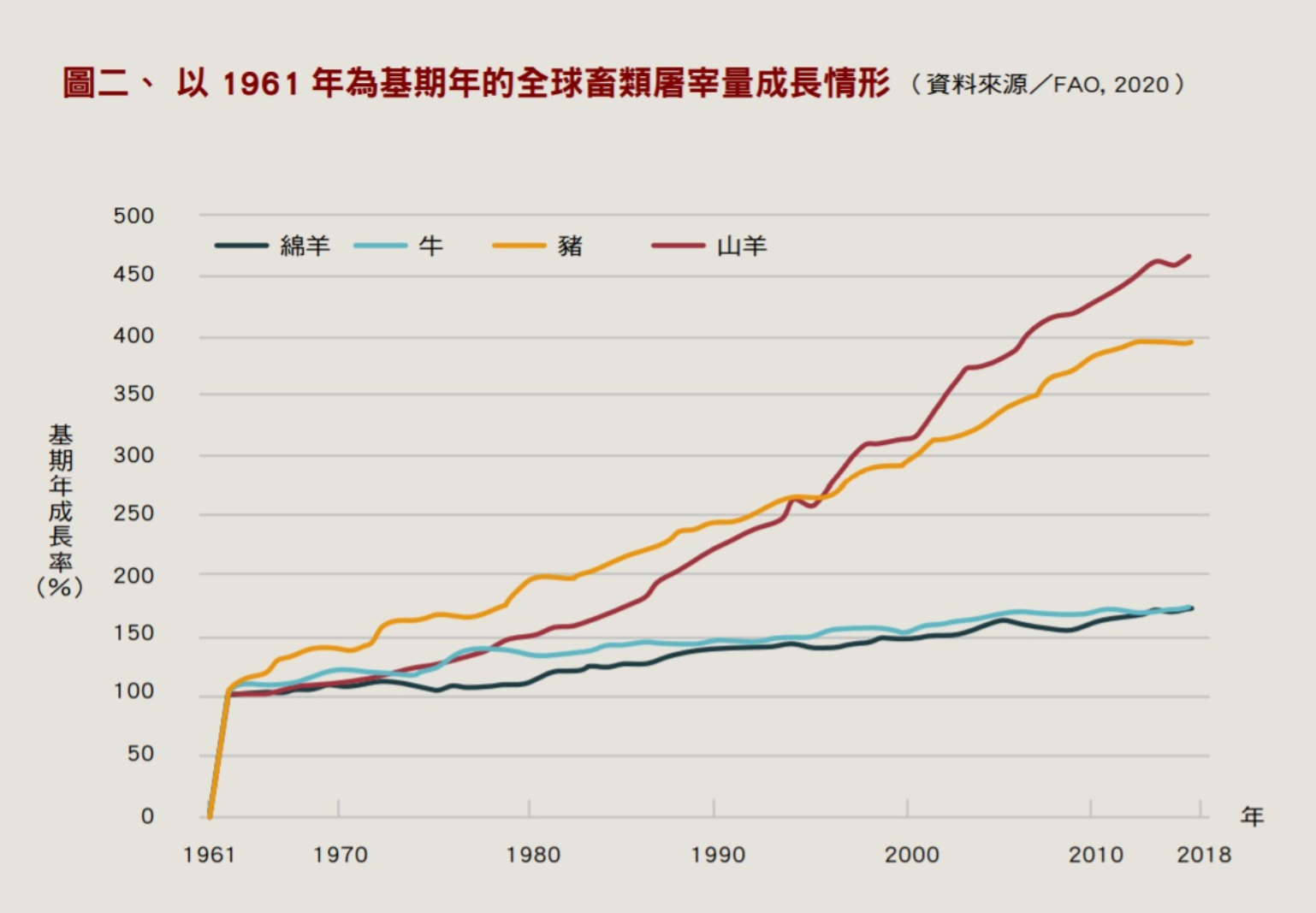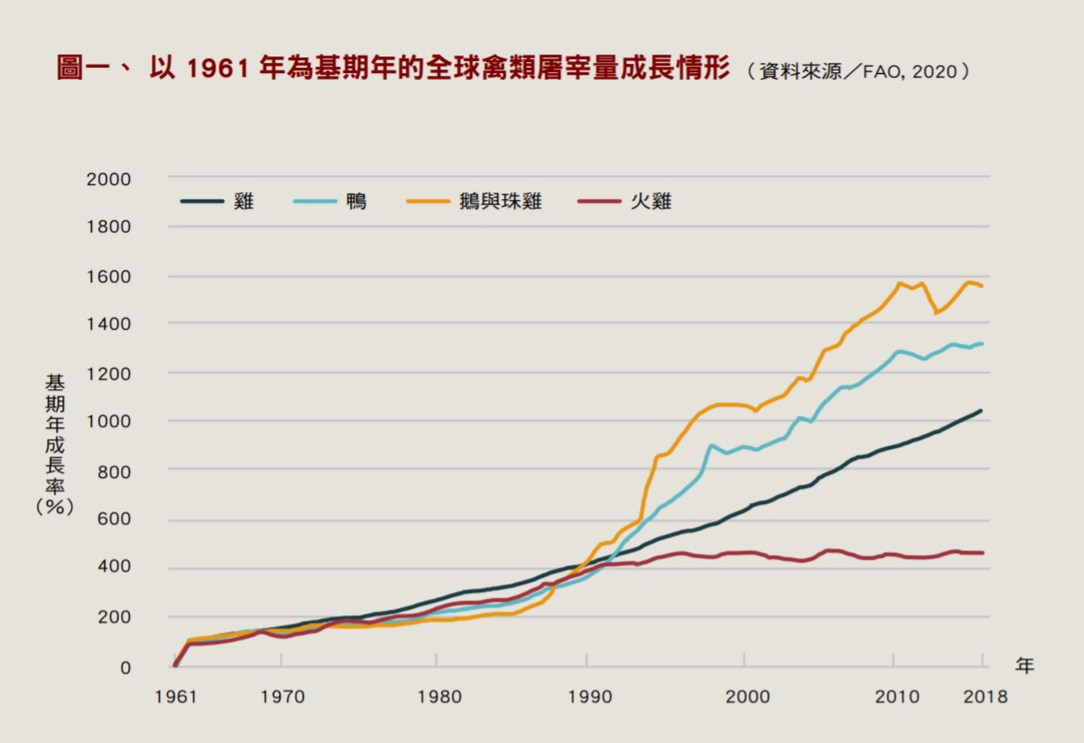 根據聯合國糧農組織對全球畜禽屠宰量的統計資料(FAOSTAT, 2020),2018年雞、鴨、鵝及珠雞、火雞的屠宰量分別為687.8、29.8、6.9、6.5餘億隻,較1961年分別成長1,046%、1,318%、1,554%、463%(圖一),2018年牛、豬、山羊、綿羊屠宰量則分別為3.0、14.8、4.7、5.7餘億頭,較1961年分別成長175%、394%、466%、173%(圖二),顯見全世界對動物性蛋白質的需求逐年增加、對禽肉的消費需求遠大於畜肉,其中以鵝及珠雞的屠宰量成長幅度最大。