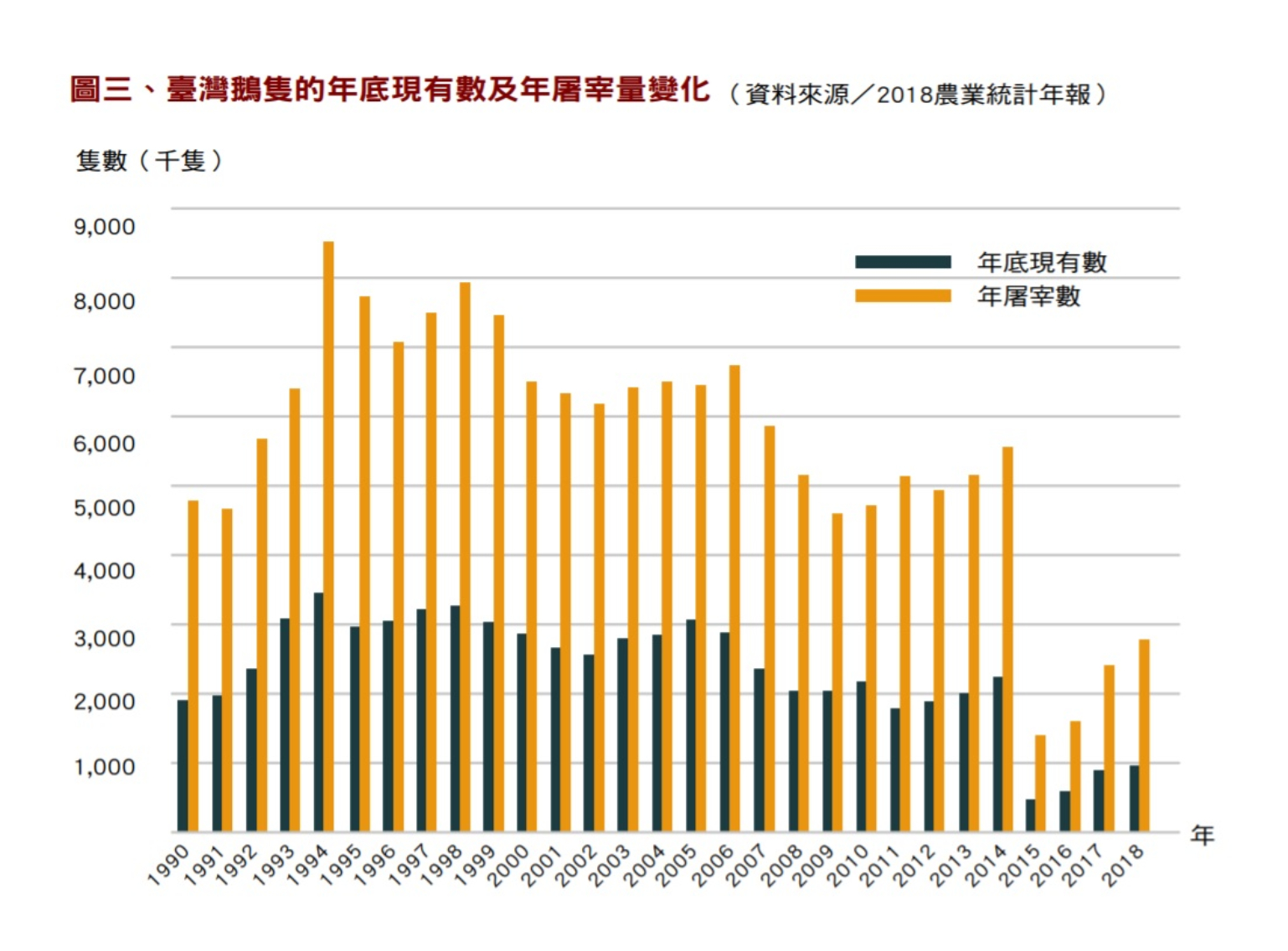 臺灣與中國、波蘭、匈牙利都是國際上重要的養鵝大國,臺灣在2015年發生禽流感疫情之前,每年約有500萬羽以上的肉鵝屠宰上市(圖三;行政院農業委員會,2018)。