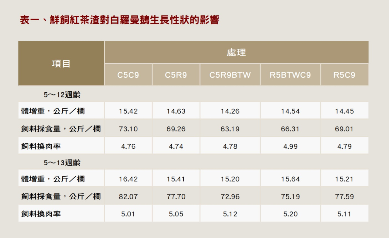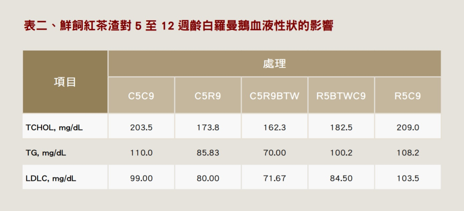 接著下一步,選用占國內鵝隻在養量達97%以上的白羅曼鵝試驗紅茶渣應用於肉鵝飼養的效果,結果無論是在5~8週齡的生長階段或是9~12週齡的肥育階段,以減餵20%完全飼料量,但額外提供新鮮紅茶渣讓肉鵝採食,並不會顯著影響上市時的飼料換肉率及增重表現(表一),鵝隻血漿中的三酸甘油酯、總膽固醇也顯著低於未額外提供新鮮紅茶渣的對照組(表二)。
