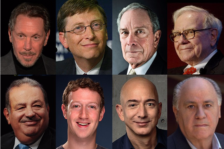根據樂施會的研究,目前世界上相對貧窮的半數人口(超過36億人)所擁有的財富總和,已經追不上最有錢的前八位首富,而在這八個人當中有六個都是美國籍,分別是微軟(Microsoft)創辦人比爾蓋茲(Bill Gates)、柏克夏海瑟威(Berkshire Hathaway)創辦人華倫巴菲特(Warren Buffett)、亞馬遜(Amazon)創辦人傑夫貝佐斯(Jeff Bezos)、甲骨文(Oracle)創辦人賴瑞艾利森(Larry Ellison)、彭博社(Bloomberg)創辦人麥可彭博(Michael Bloomberg),以及臉書(Facebook)創辦人馬克祖克柏(Mark Zuckerberg)。