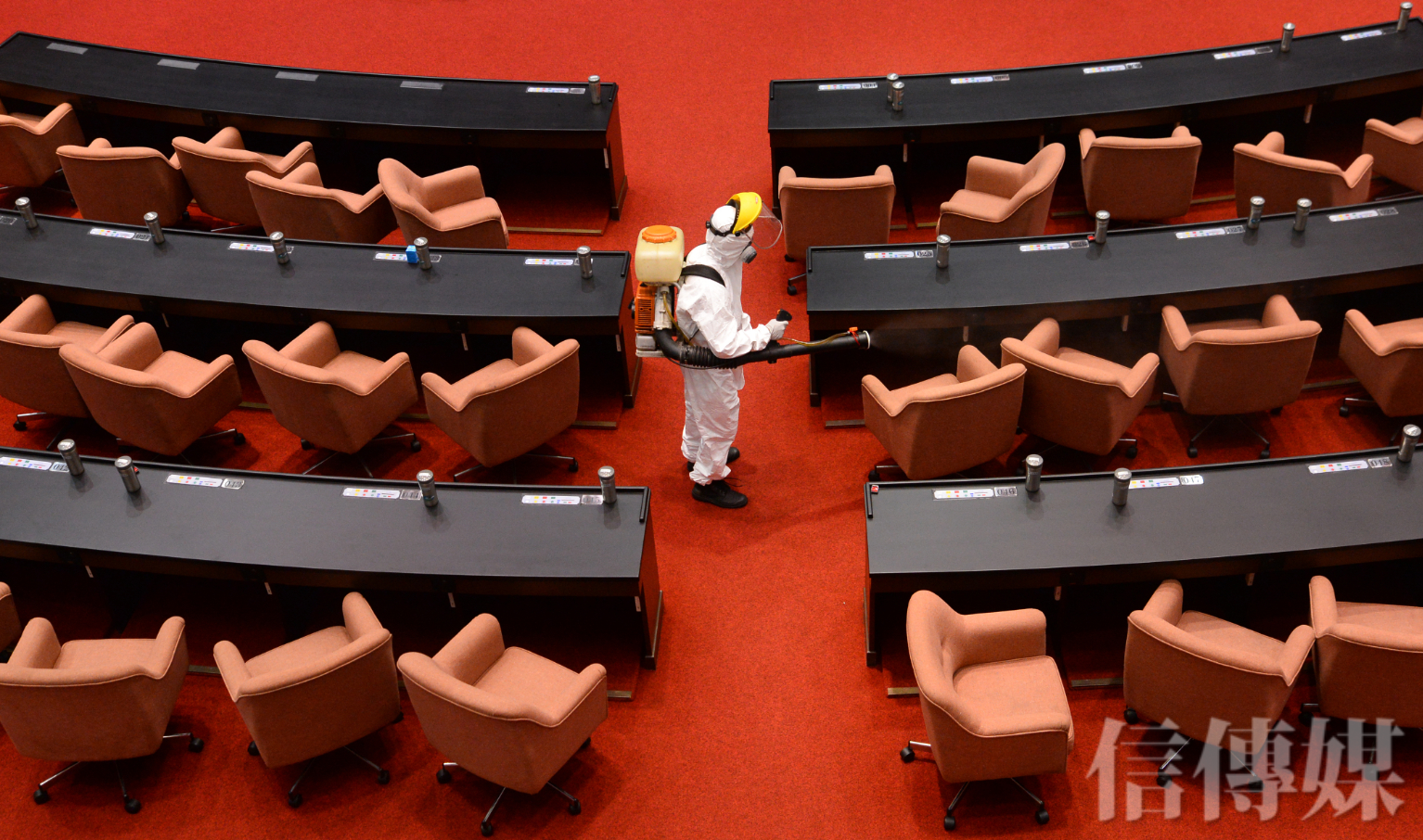 捷克團離去後,立法院工作人員針對立委的位置進行消毒。(攝影/趙世勳)