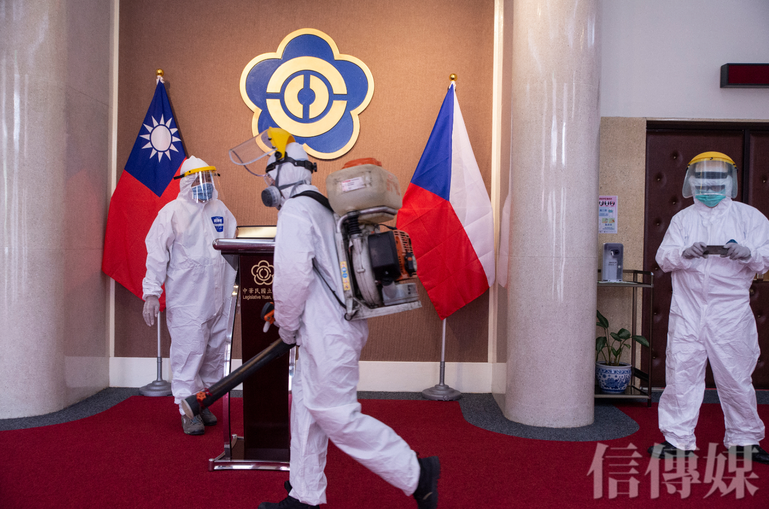 立法院工作人員跟隨捷克團於立法院議場所到之處進行消毒。(攝影/趙世勳)