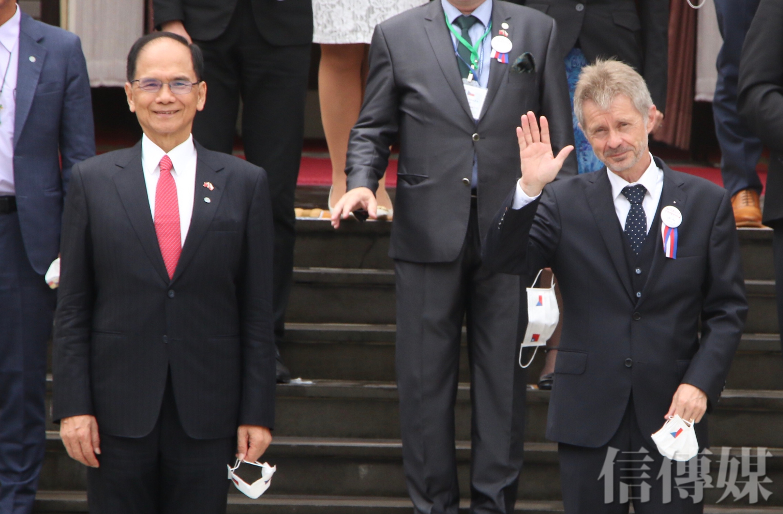 立法院長游錫堃與捷克參議長維特齊於議場門口向媒體揮手致意、合影。(攝影/趙世勳)
