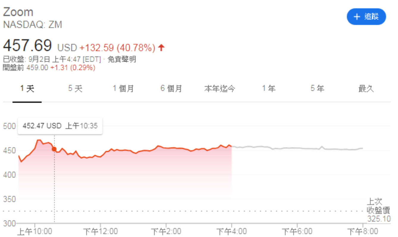 Zoom股價周一收盤上揚8.6%,周二收盤狂飆132.5美元,漲幅40.8%,創457.69美元的歷史新高,是直衝上1291.16億美元,今年來累計狂飆6倍。
