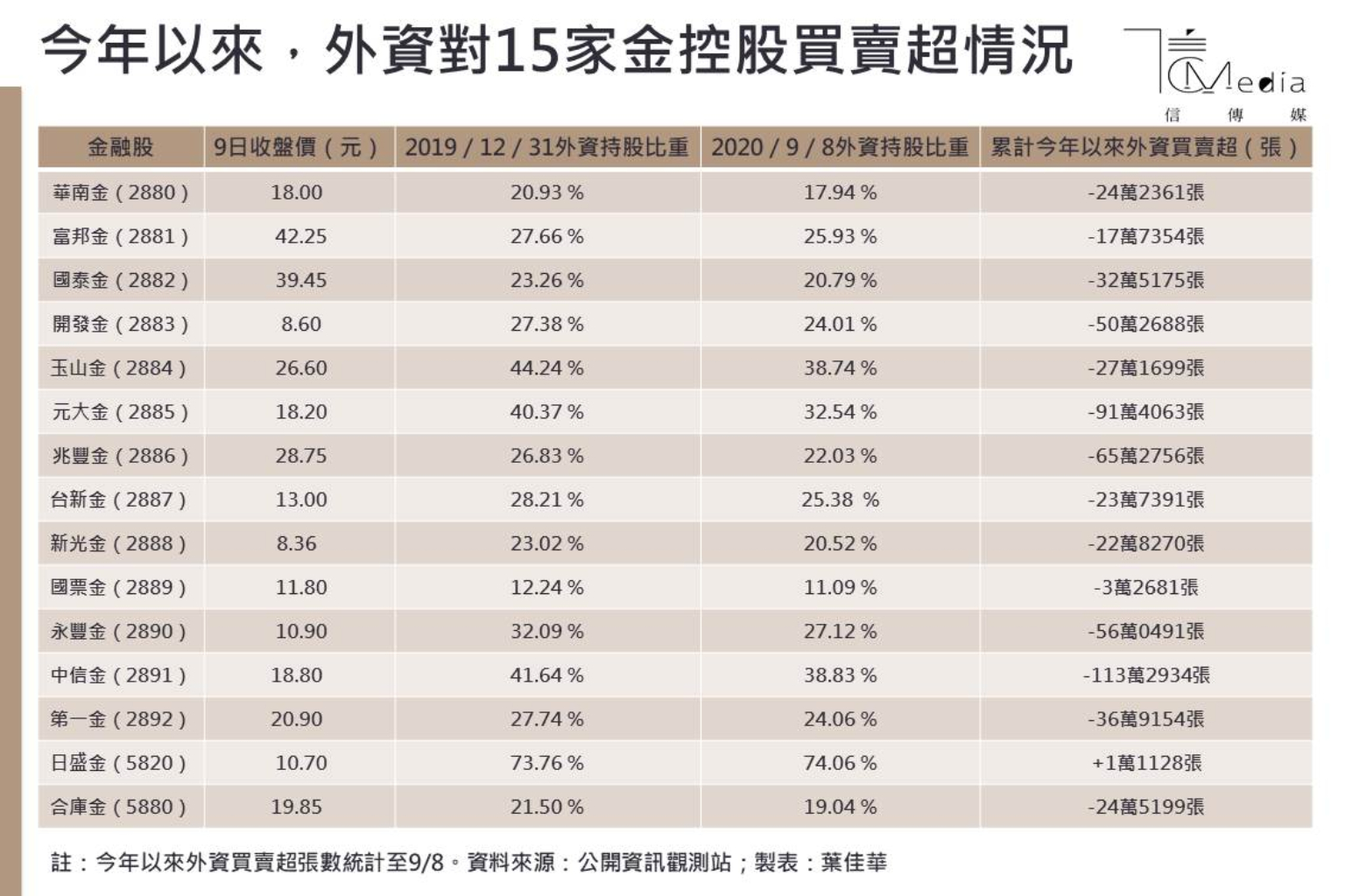 若拉長時間來看,根據《信傳媒》進一步彙整,今年以來外資對於國內15家金控股的買賣超情況,發現除了日盛金之外,其餘14家金控的外資持股比重,今年皆比去年底的水位來的低。