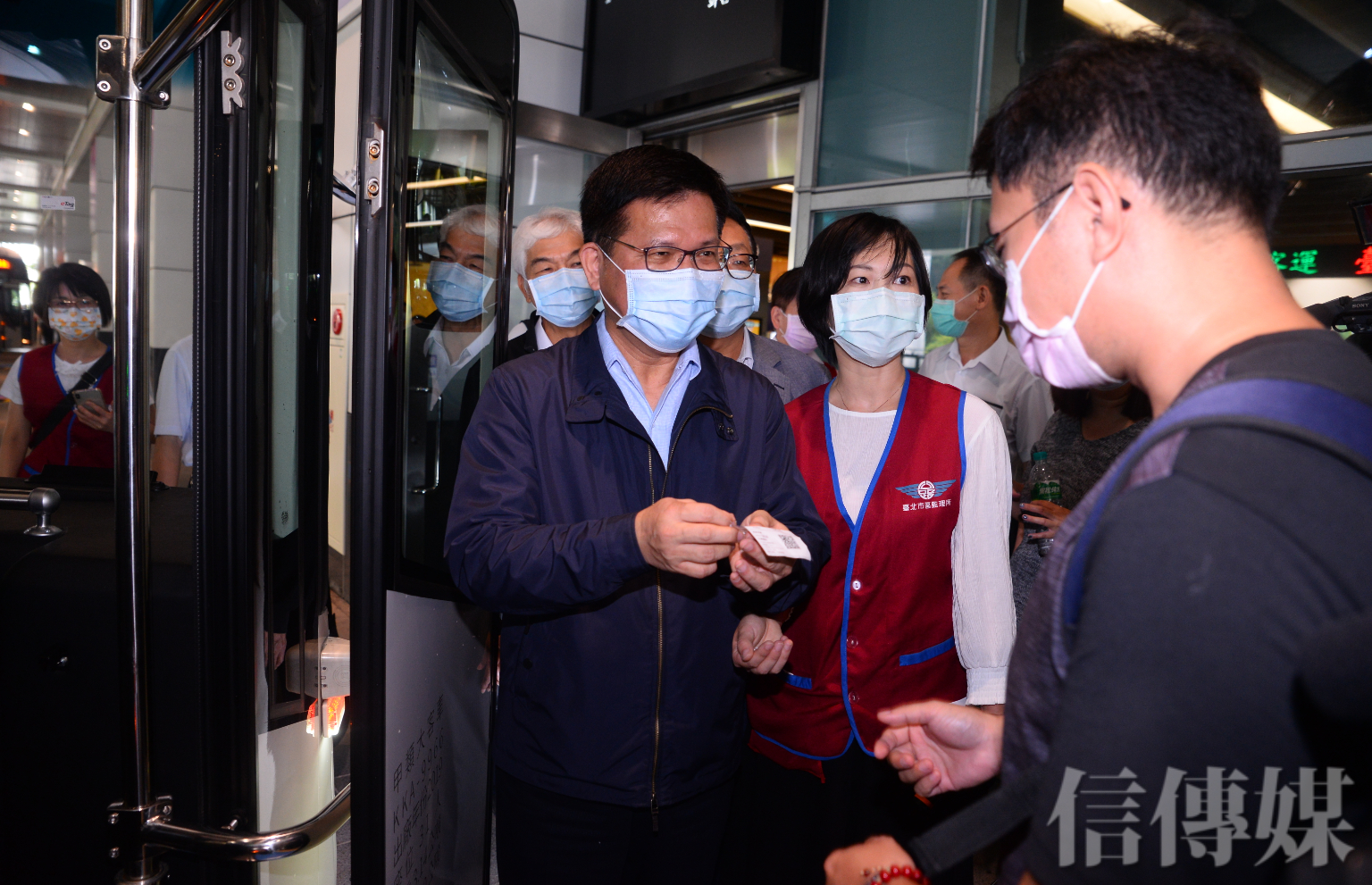 今(11)日林佳龍視察南港轉運站,林佳龍於月台上為乘客驗票。(攝影/趙世勳)
