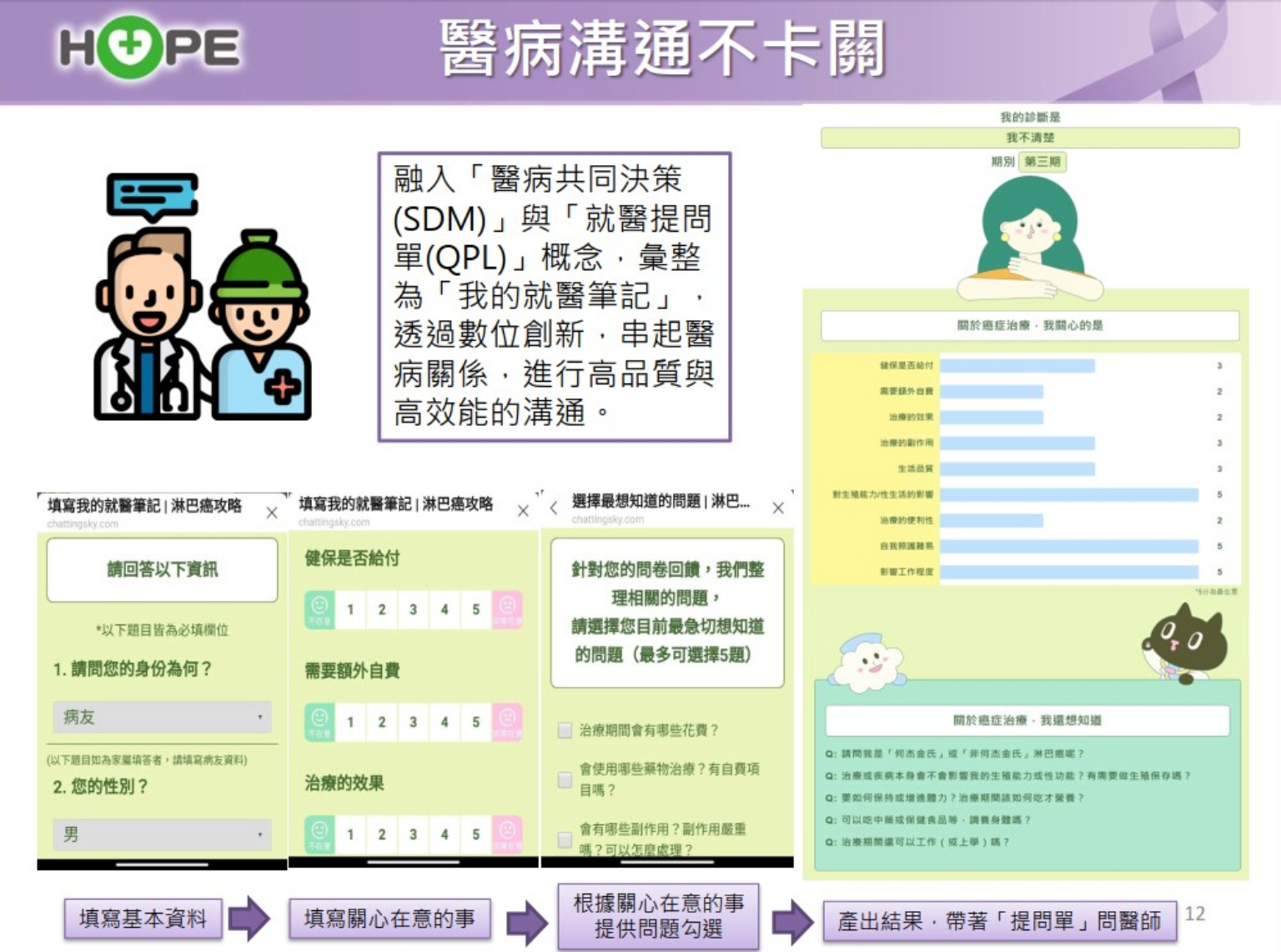 他也表示,《淋巴癌攻略》提供完整的「治療分期流程」,協助病友迅速釐清疾病分類與治療方式,首創的「我的就醫筆記」功能,融合醫病共享決策(SDM)、就醫提問單(QPL)精神,協助病友在就診或做醫療決策前檢視個人病況、經濟與治療問題等各項考慮因素,從而產出個人化的就醫提問單,「裡面的問題包括治療是否影響工作、未來是否可以結婚生子、是否會要用到自費藥物、藥物副作用等,透過簡單的個人化問題,在不影響個資的情況下進行有效溝通。」