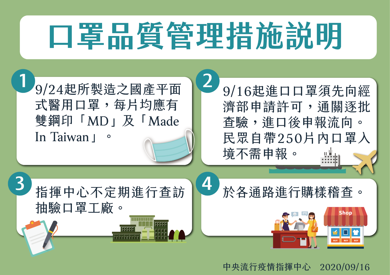 至於原訂自9月17日起實施國產製之平面式醫用口罩,須逐片以鋼印標示「MD」及「Made In Taiwan」(雙鋼印標示),以及實名制藥局販售之口罩均會有雙鋼印標示,但陳時中表示,由於各口罩廠鋼印滾輪安裝與軟硬體調校作業需要更充裕時間,且鋪貨至藥局及超商的物流工作也需預留一定作業時間,經與各業者協調,將調整至9月24日起實施。