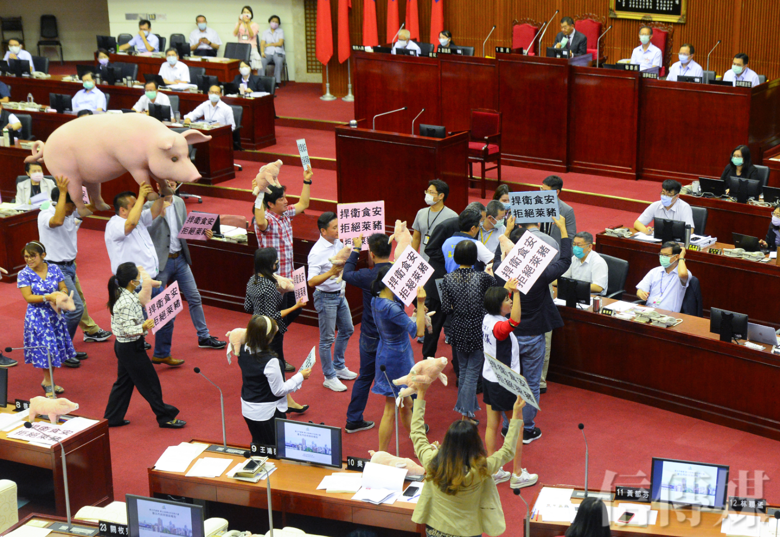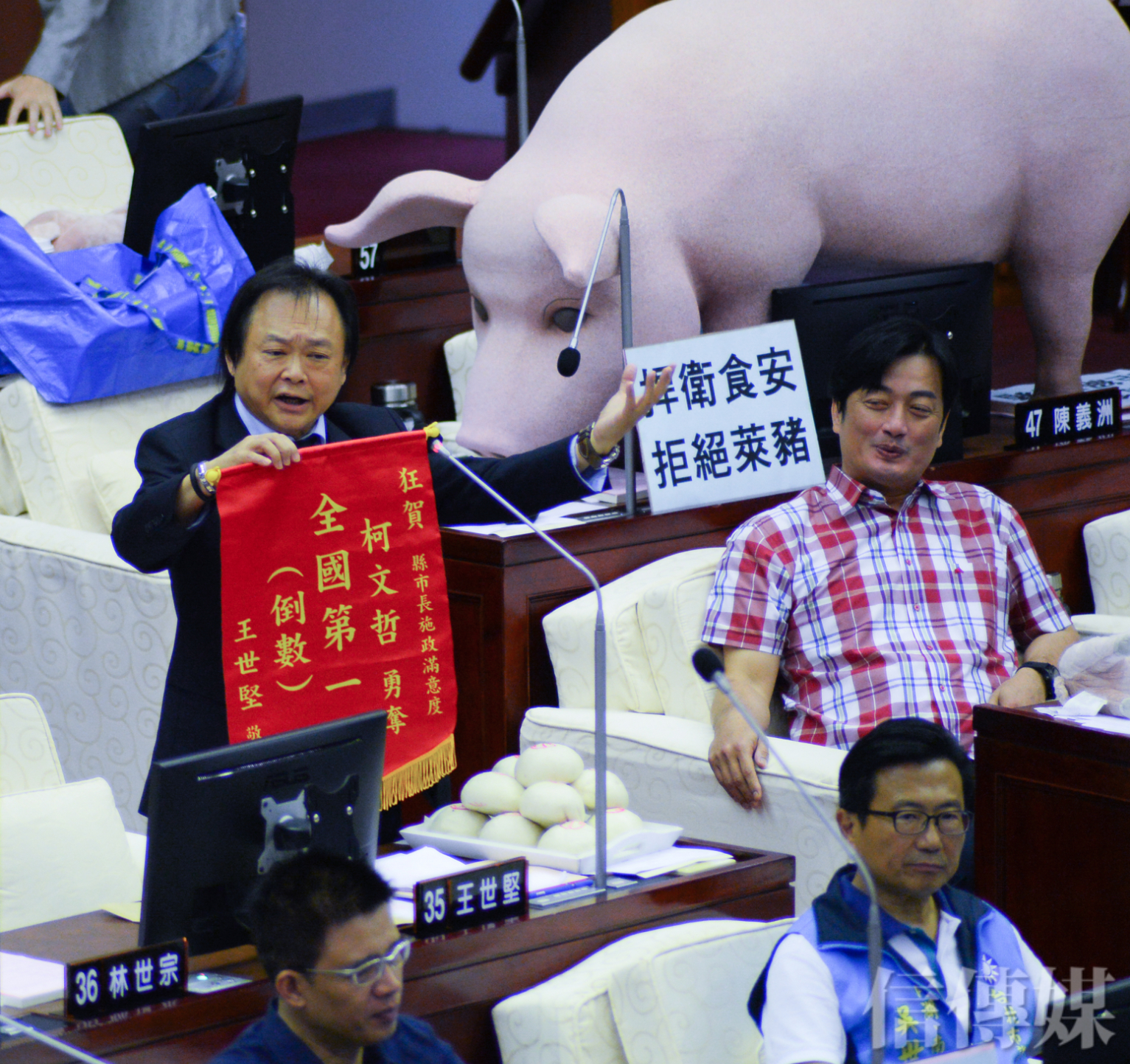 藍營議員還扛著大粉紅豬走向柯文哲坐位,問柯是否要和市民站在一起, 並高喊「捍衛食安、拒絕萊豬」的口號,要求柯文哲簽署針對萊豬進口承諾書。最後柯文哲雖然有對聲明打勾,但未明確簽署,對於聲明第一條「全力支持零檢出萊豬進入北市」修改後寫下「既然零檢出,就不叫萊豬,邏輯不對需再修改」。