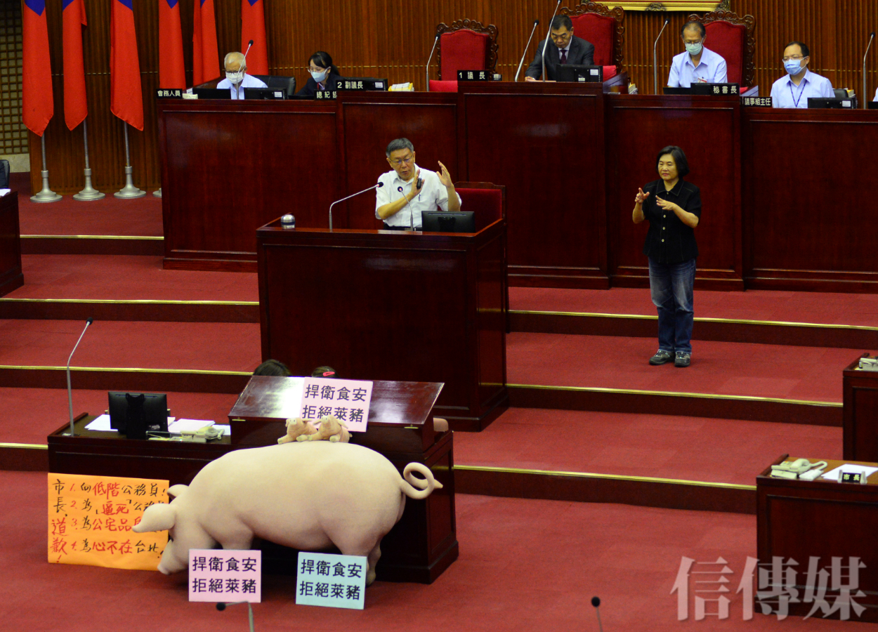 近日美豬議題造成藍營人士反對,台北市議會本屆會期開議,市長柯文哲今(17日)赴議會進行施政報告時便接招,國民黨團祭出的美豬議題,更準備多隻小粉紅豬、一隻巨大粉紅豬及標語等不少道具,要求柯文哲明確對反美豬表態,並要求簽署捍衛食安、拒絕「萊豬」(含有萊克多巴胺的美豬)聲明,另外在面對藍營的質詢,柯文哲更透露「投入2024大選」的想法,引起高度關注。